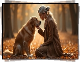 Kobieta, Blondynka, Płaszcz, Pies, Golden retriever, Jesień