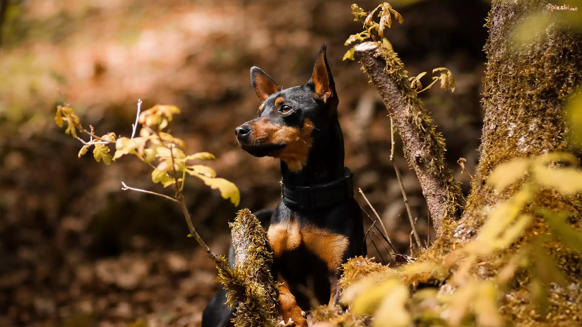 Pies Pies, Pinczer miniaturowy, Drzewo, Rośliny, Liście