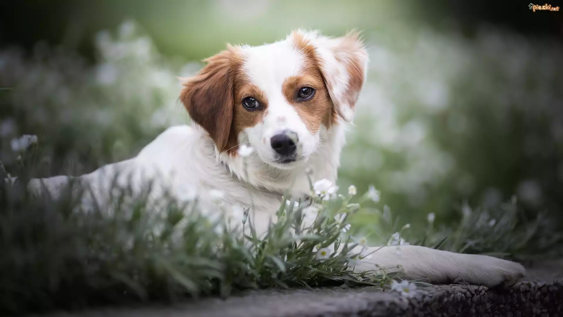 Pies, Kwiaty, Trawa, Rozmyte, Tło
