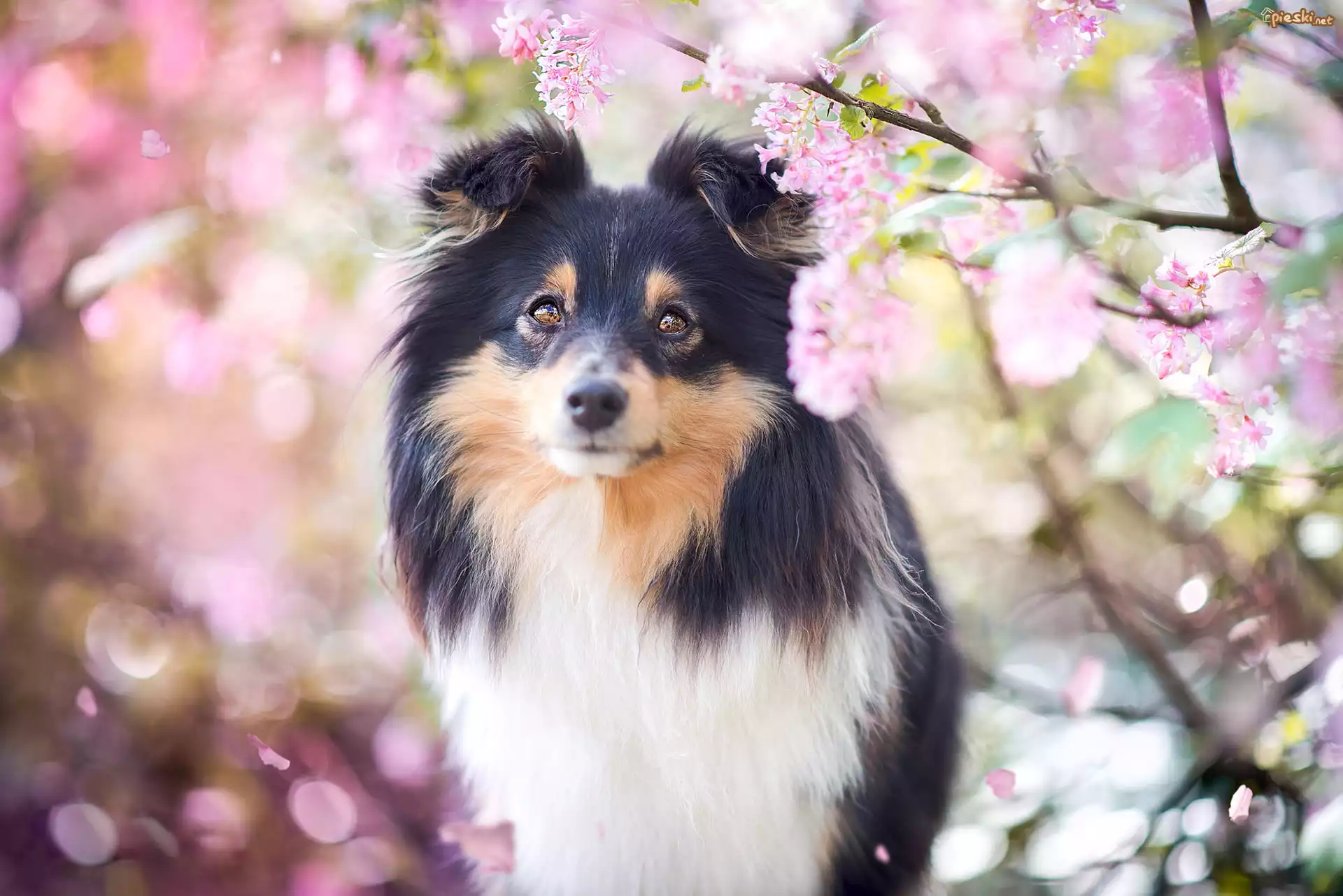 Pies, Owczarek szkocki, Gałązki, Różowe, Kwiaty