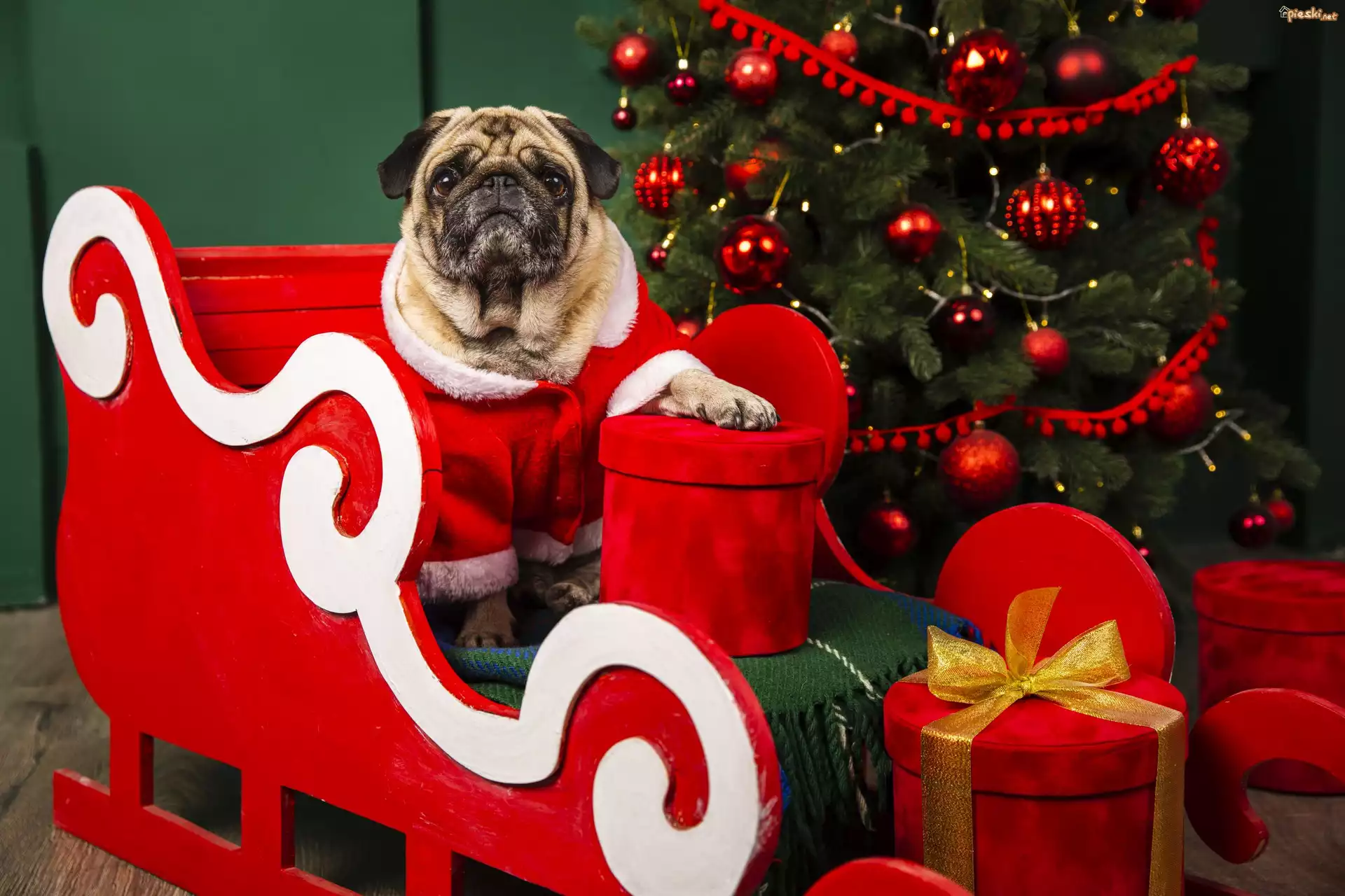 Sanie, Pies, Mops, Kubraczek, Prezenty, Choinka, Bobki