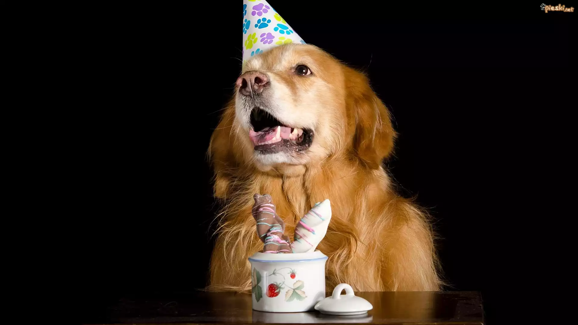 Pies Pies, Golden retriever, Czapeczka, Słodkości, Stół