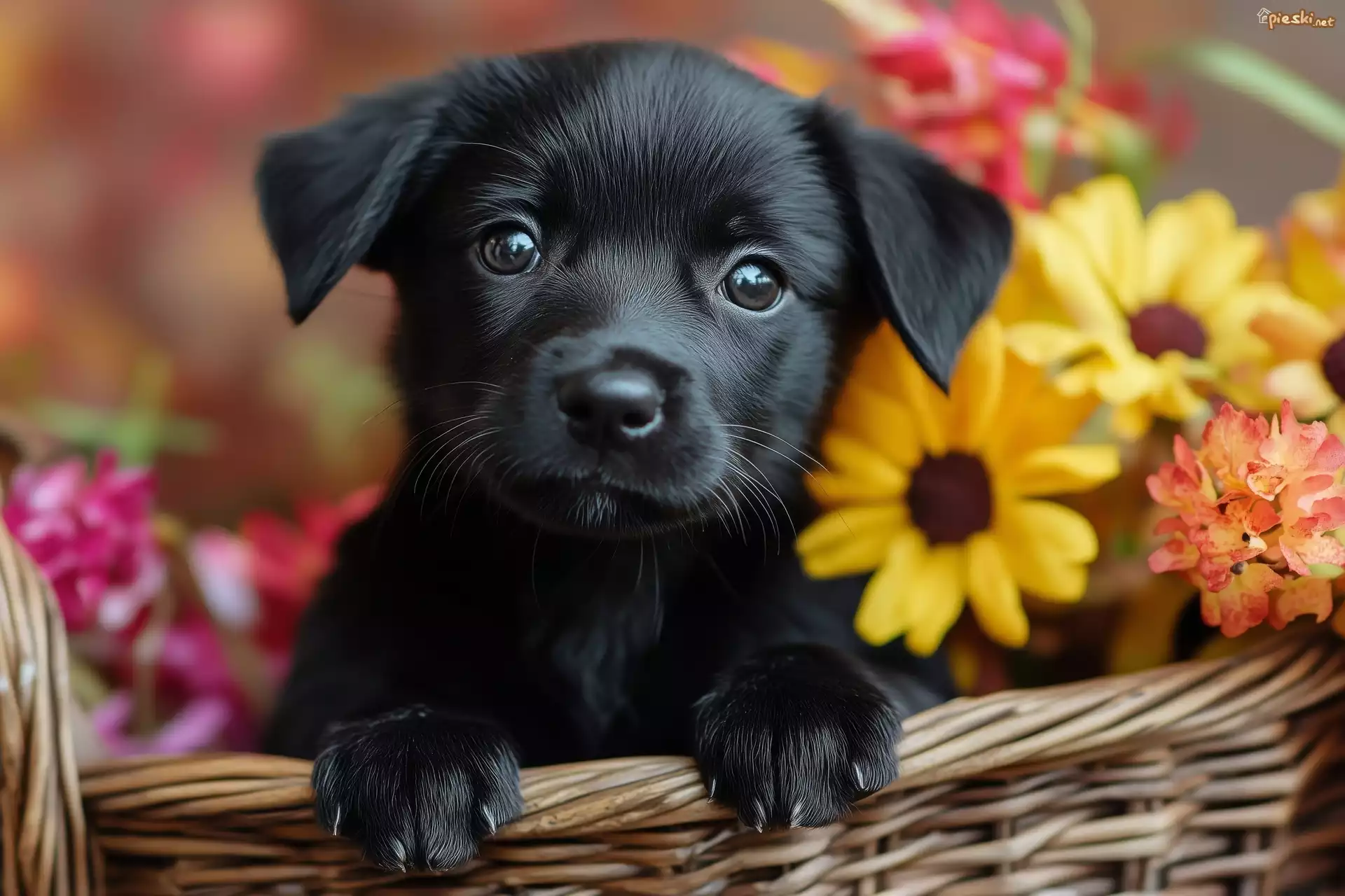 Czarny, Pies, Szczeniak, Kwiaty, Koszyk
