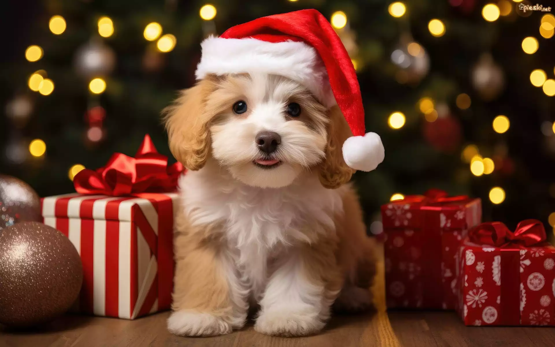 Pies Mikołajki, Pies, Szczeniak, Czapka, Prezenty