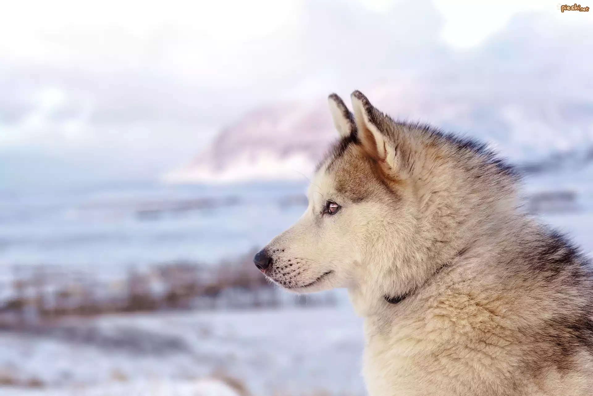 Pies Zima, Pies, Siberian husky, Profil, Głowa, Rozmyte Tło