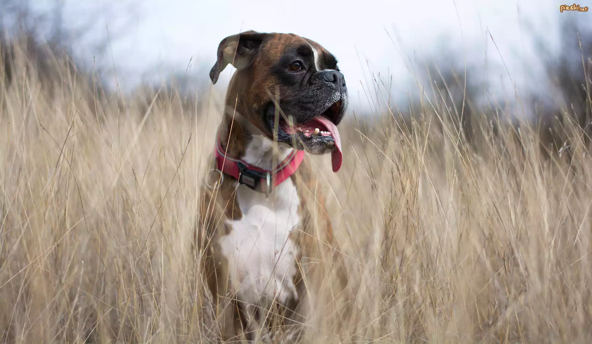 Pies Pies, Bokser, Trawa, Obroża