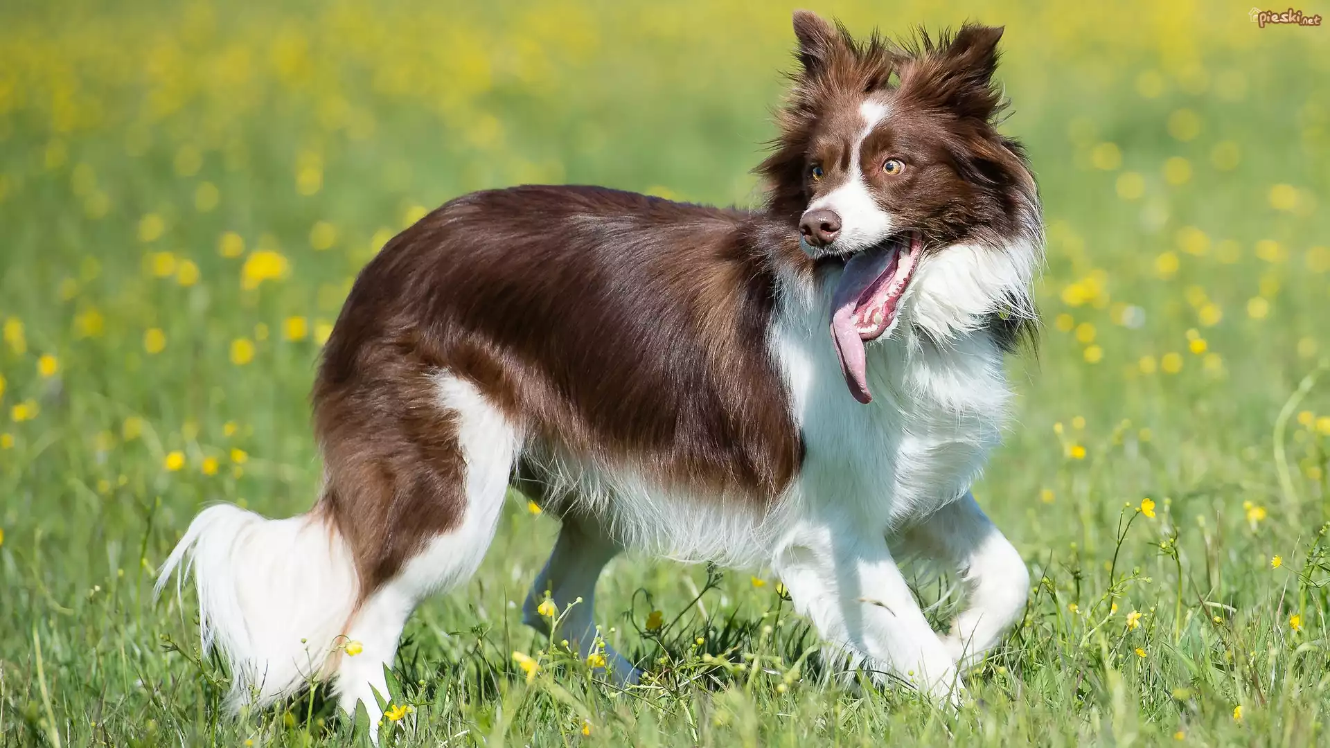 Pies, Border collie, Łąka, Trawa, Kwiaty
