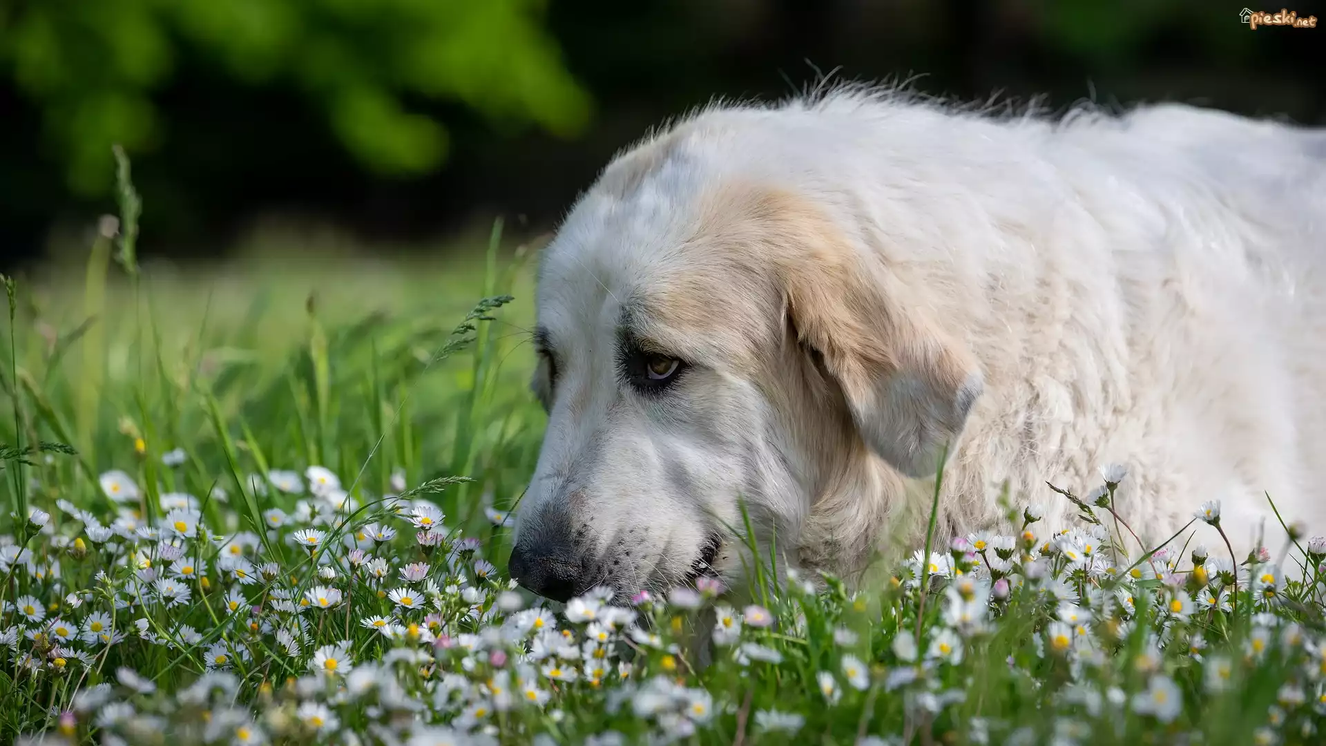 Pies Pies, Pirenejski pies górski, Trawa, Stokrotki