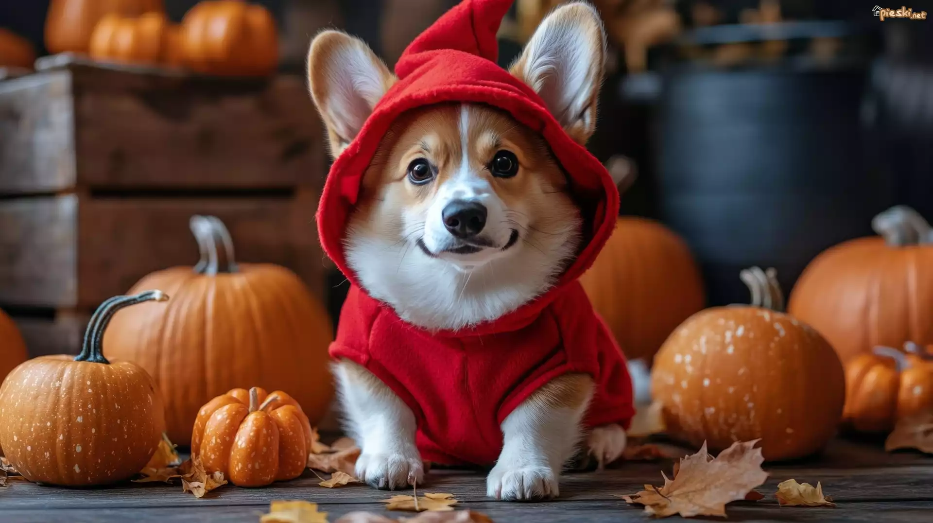 Pies Pies, Welsh corgi pembroke, Czapka, Czerwone, Ubranko, Dynie, AI