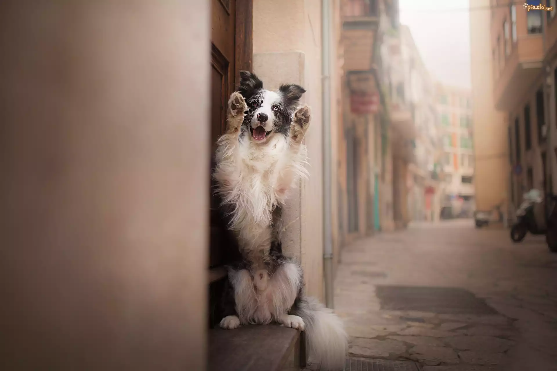 Pies Pies, Border collie, Postawa, Uliczka, Kamienice