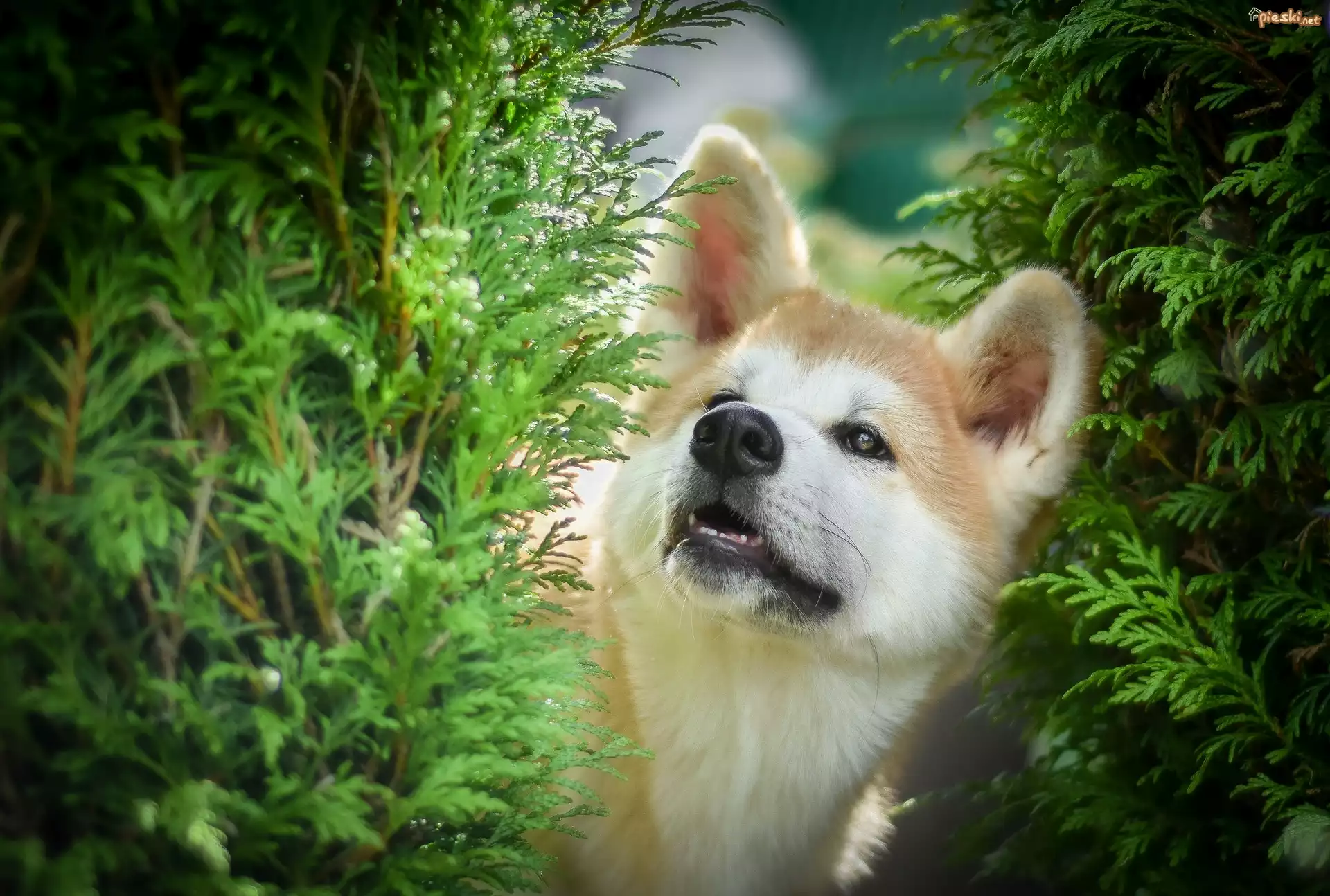 Pies Pies, Akita inu, Zielone, Gałązki