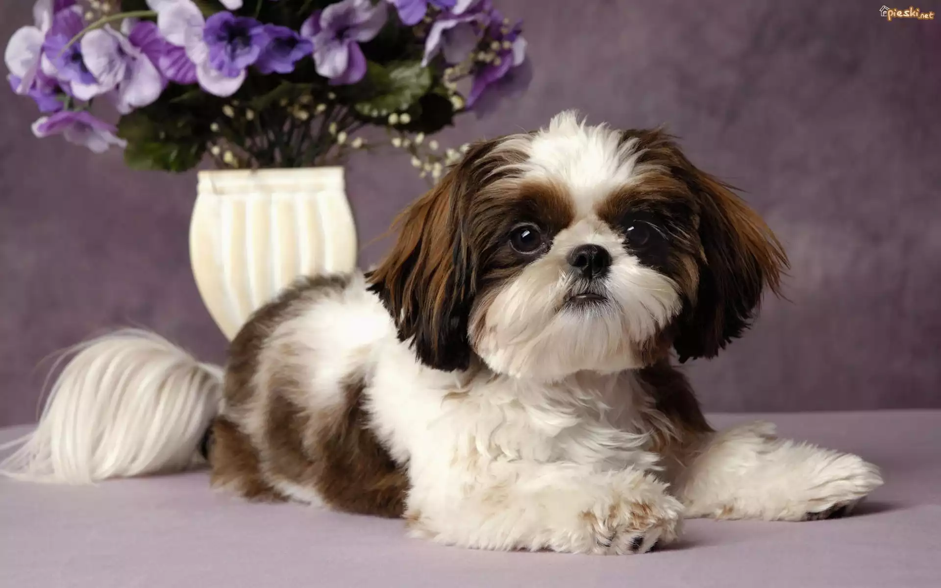 Piesek, Spaniel Japoński, Fioletowe, Kwiatuszki