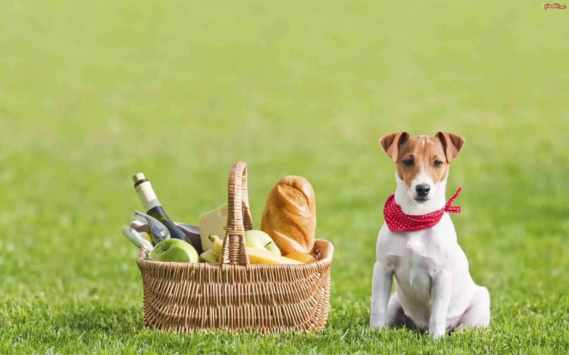Pies Pies, Jack Russell terrier, Trawa, Koszyk, Chleb, Jabłka, Piknik