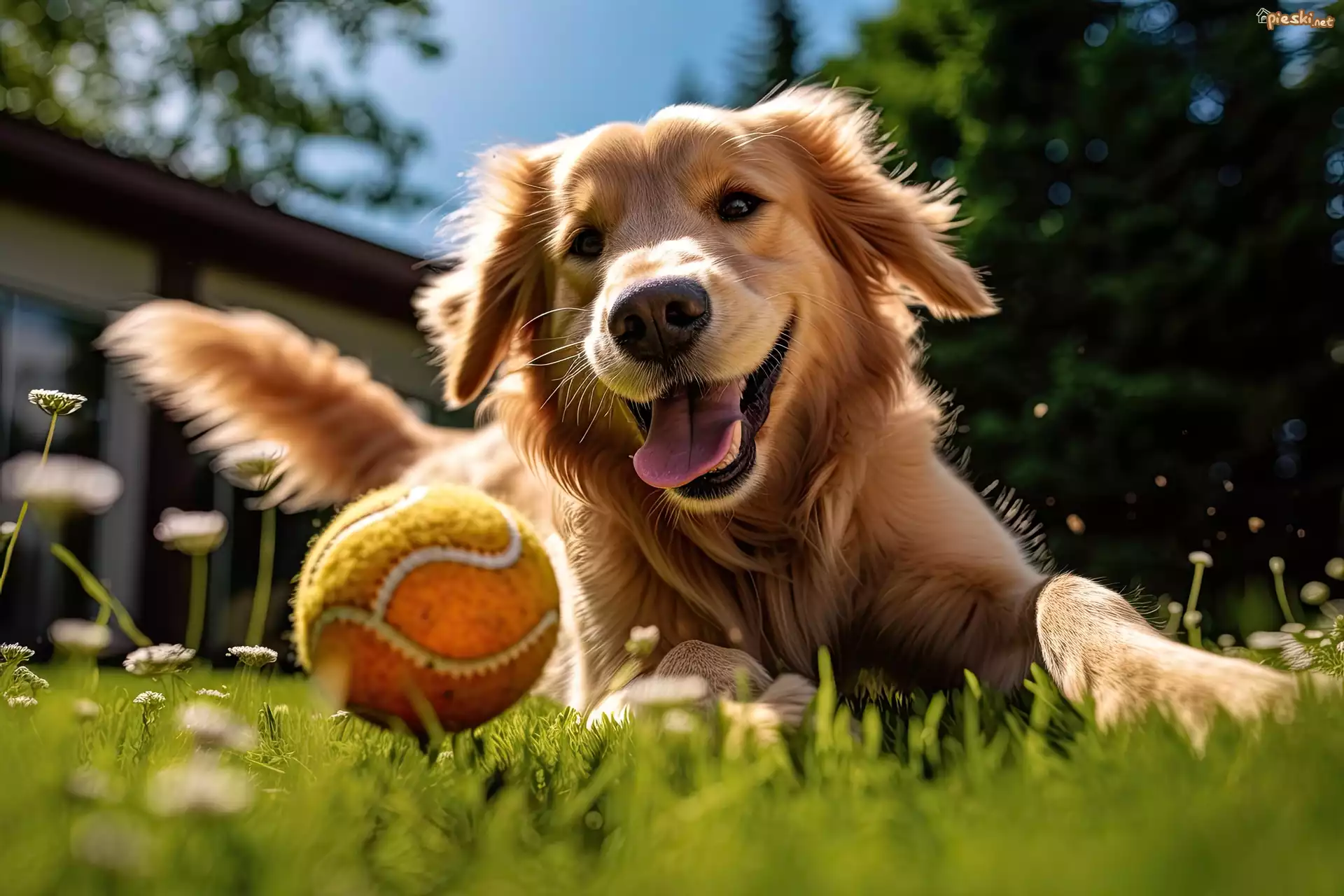 Pies Pies, Golden retriever, Piłka, Zabawa, Grafika