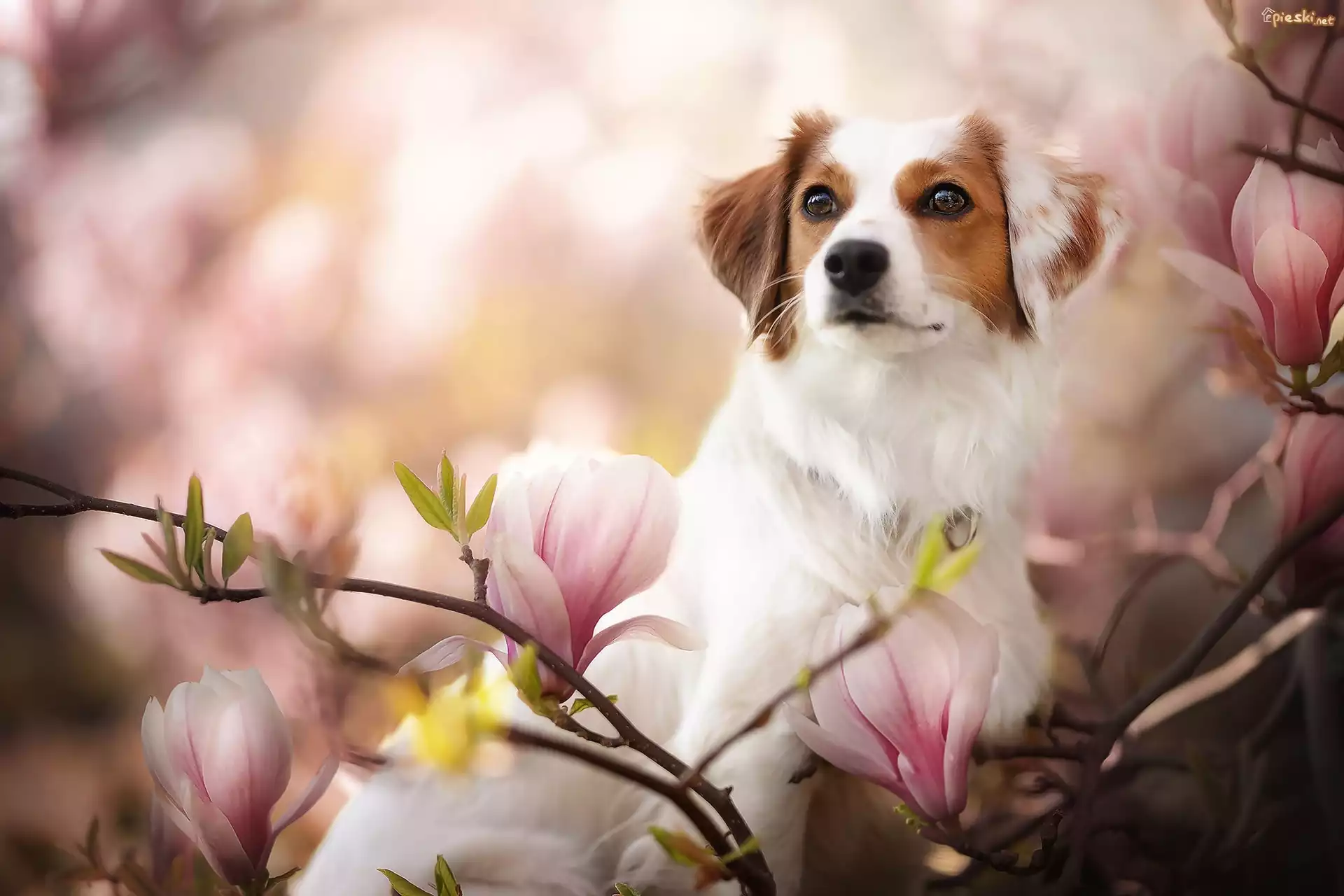 Pies Płochacz holenderski, Kooikerhondje, Magnolia, Kwiaty