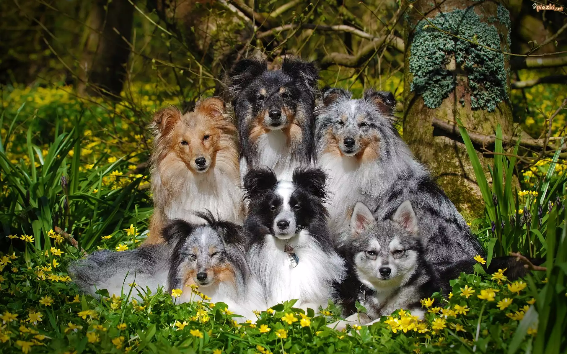 Sześć, Psów, Kundelek, Owczarki szetlandzkie, Kwiaty