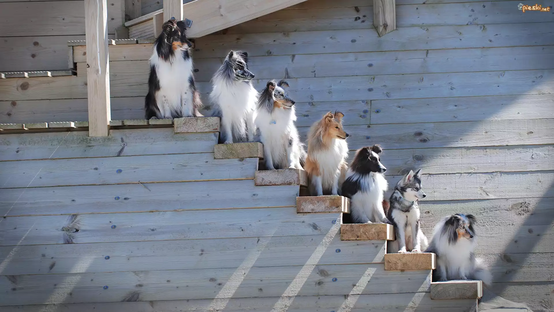 Pies Psy, Owczarki szetlandzkie, Kundelek, Drewniane, Schody