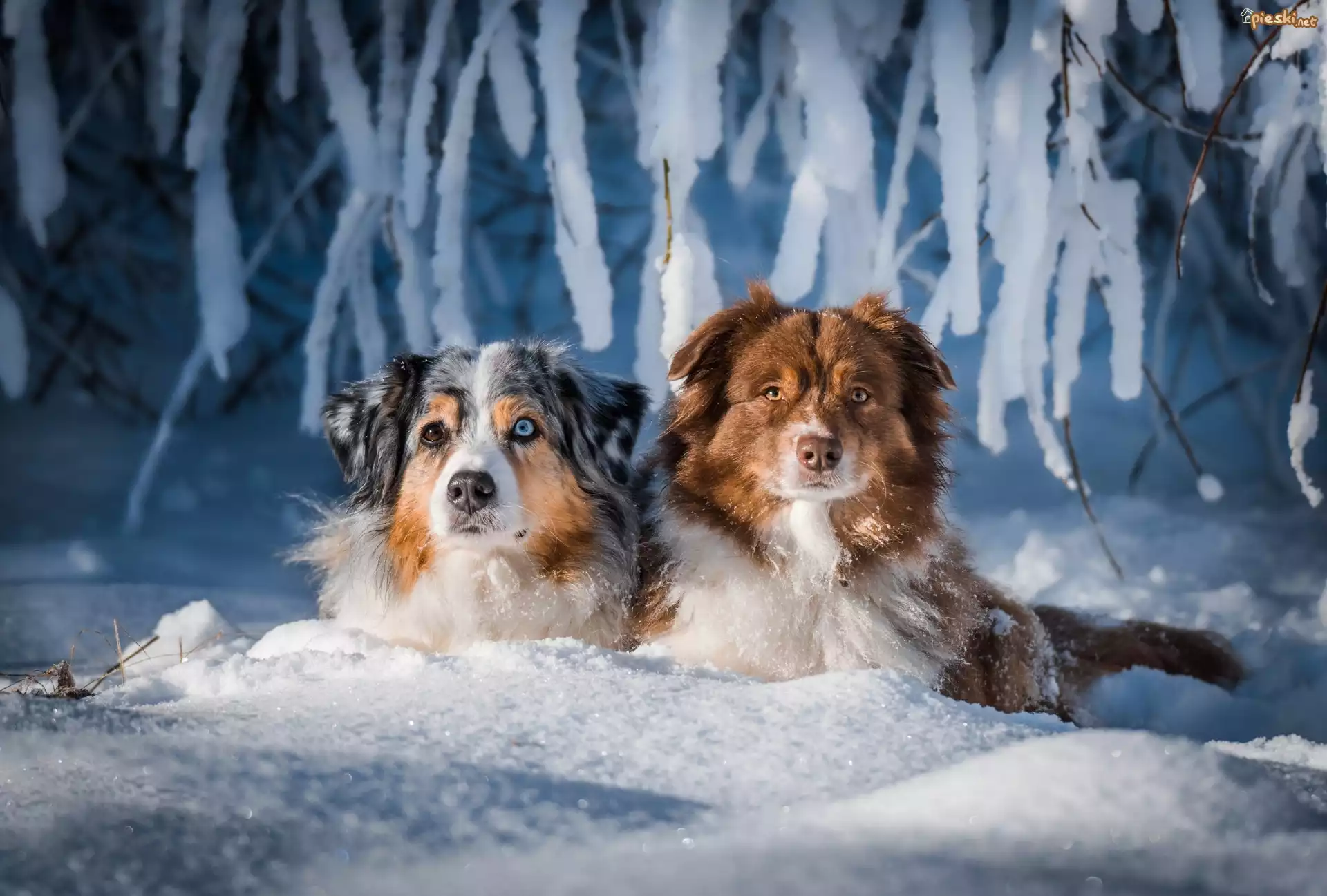 Dwa, Psy, Owczarki australijskie, Zima, Śnieg, Gałęzie