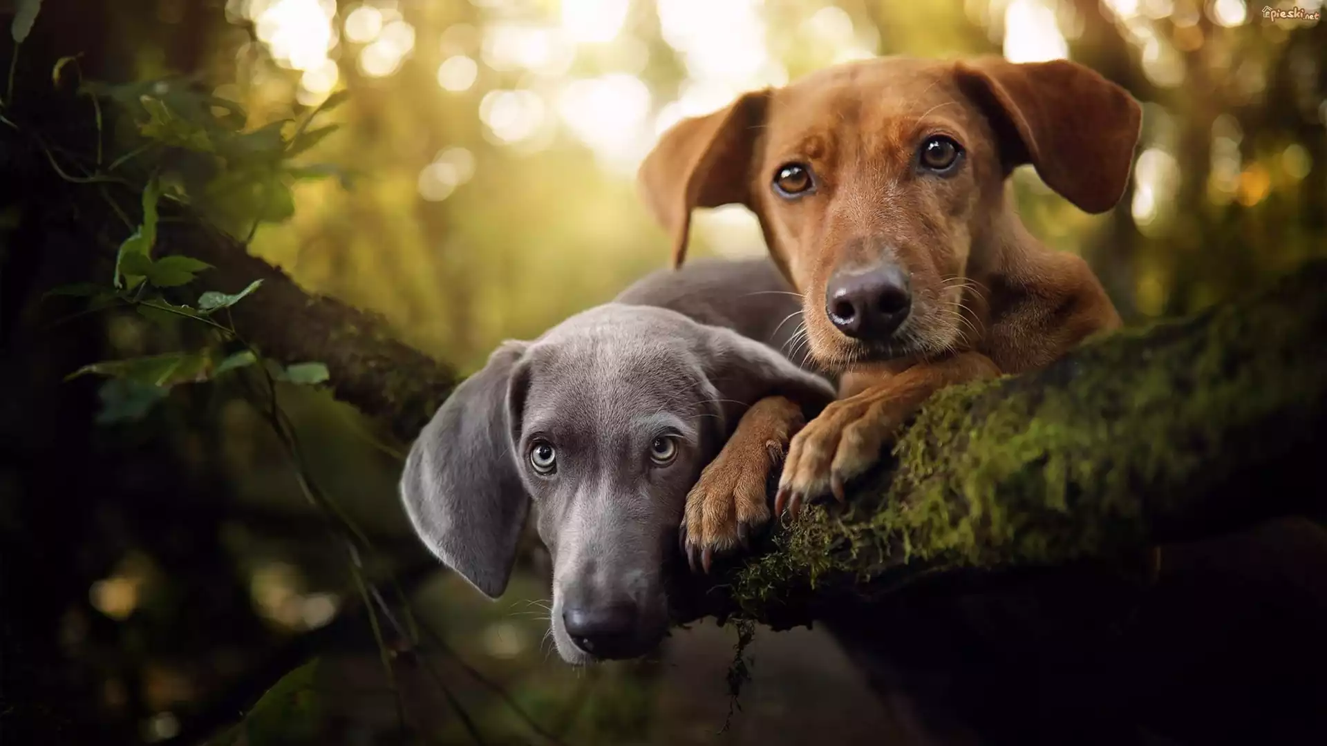 Dwa, Psy, Wyżeł weimarski, Nierasowy, Drzewo, Konar, Las