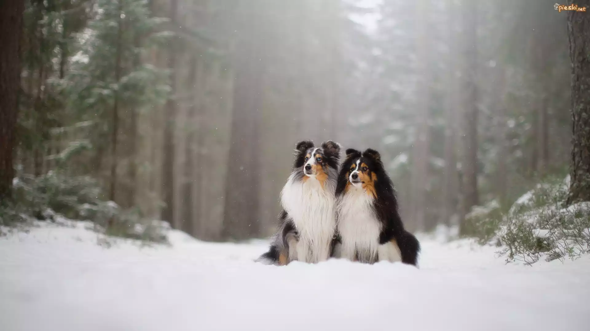 Pies Psy, Owczarki szetlandzkie, Śnieg, Las