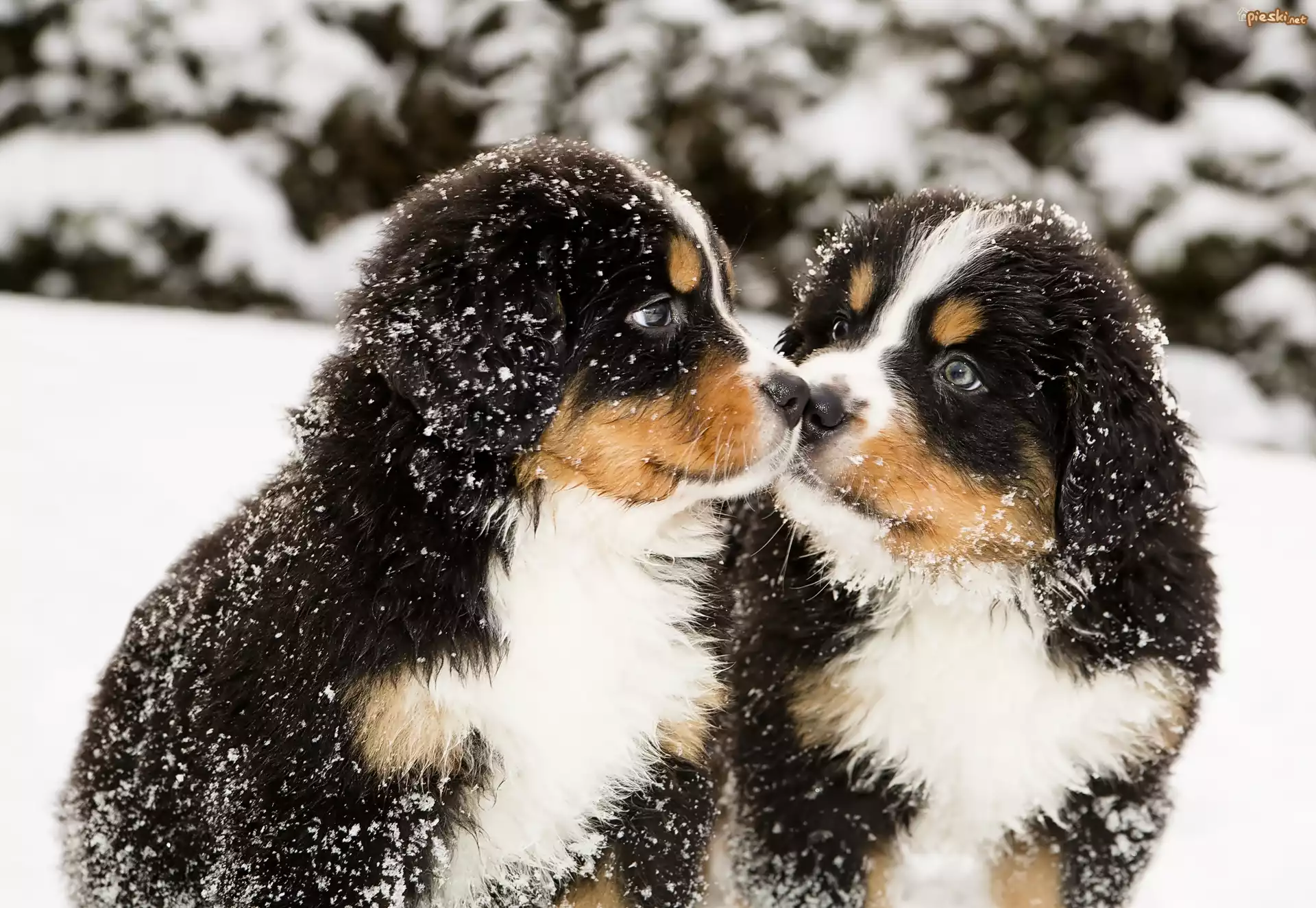 Dwa, Psy, Berneńskie psy pasterskie, Szczeniaki, Śnieg, Zima