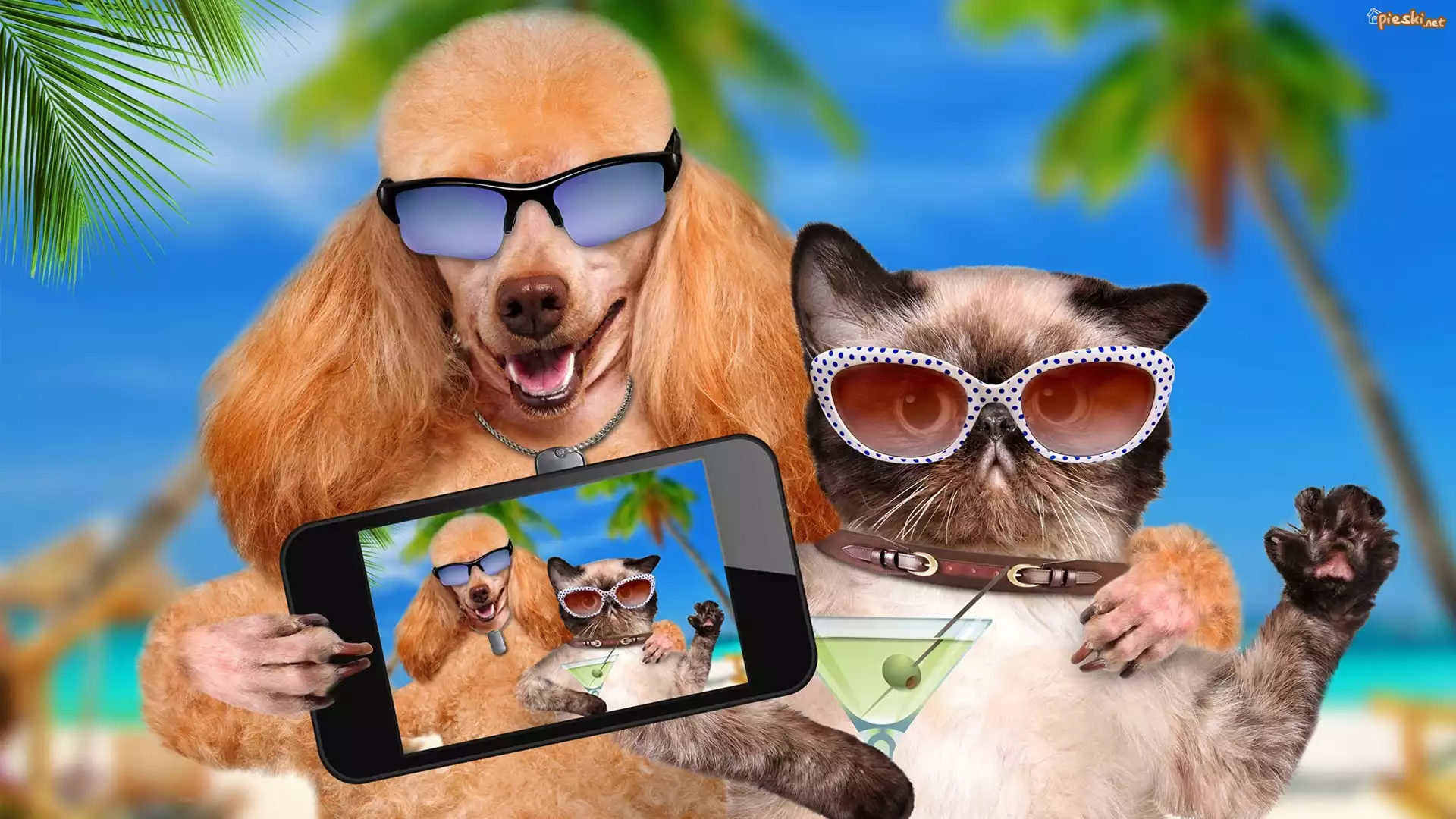 Pies Pudel, Kot, Selfie, Telefon, Okulary
