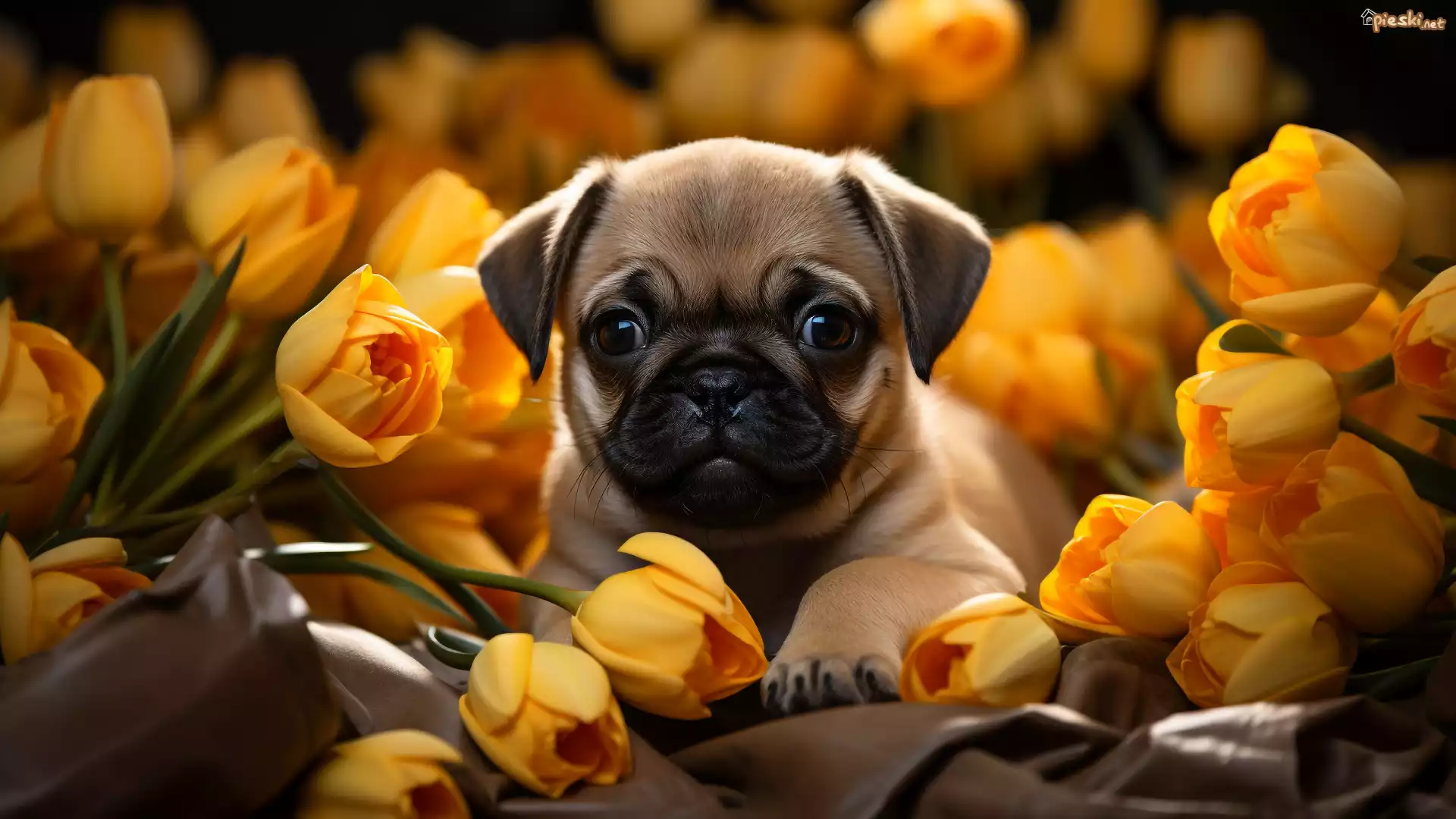 Pies Pies, Szczeniak, Mops, Pyszczek, Kwiaty, Żółte, Tulipany