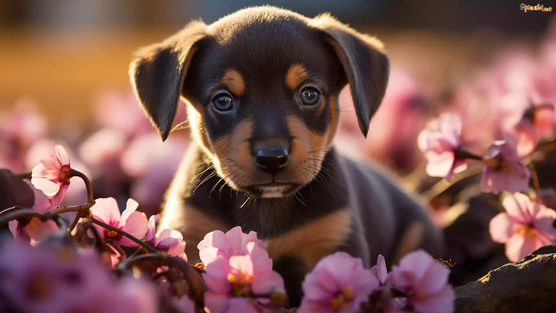 Pies Pies, Szczeniak, Gałązka, Różowe, Kwiaty, Światło
