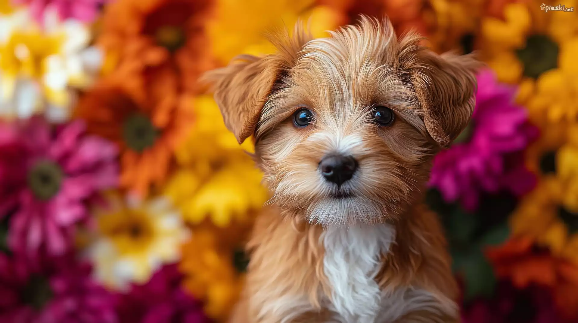 Pies Pies, Rudo-biały, Szczeniak, Kwiaty