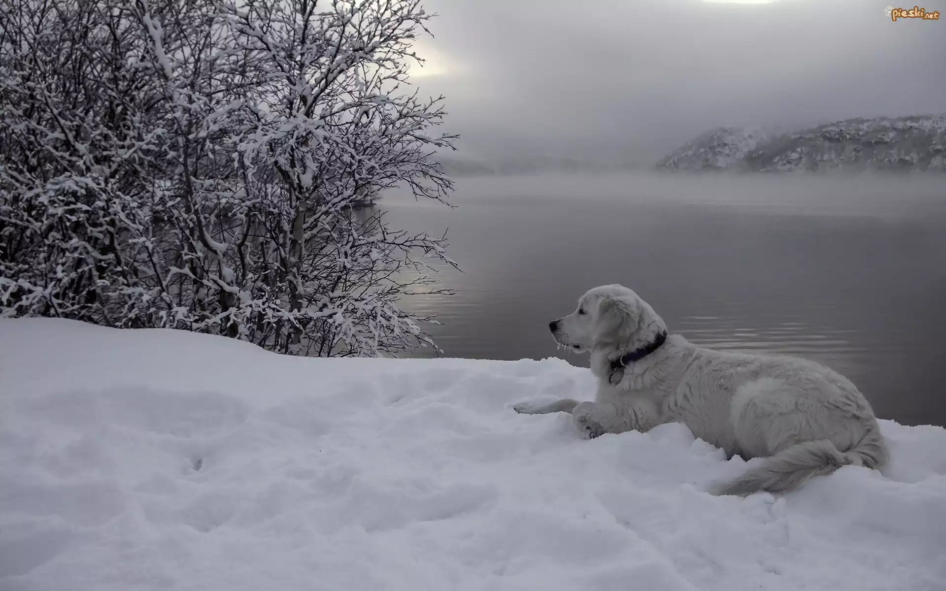Pies, Rzeka, Góry, Mgła, Drzewo, Zmrok, Zima