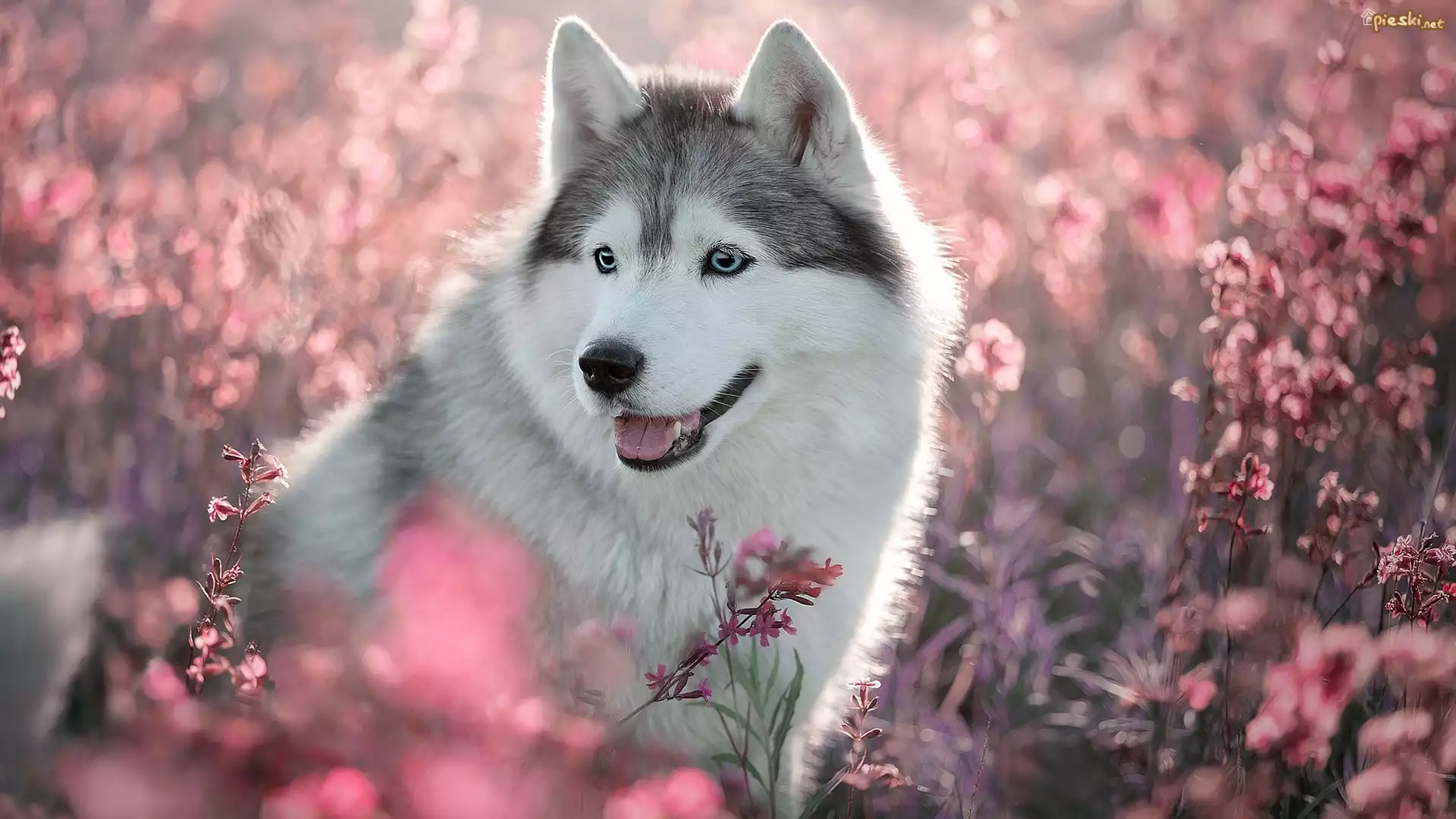 Pies Pies, Siberian husky, Różowe, Kwiaty