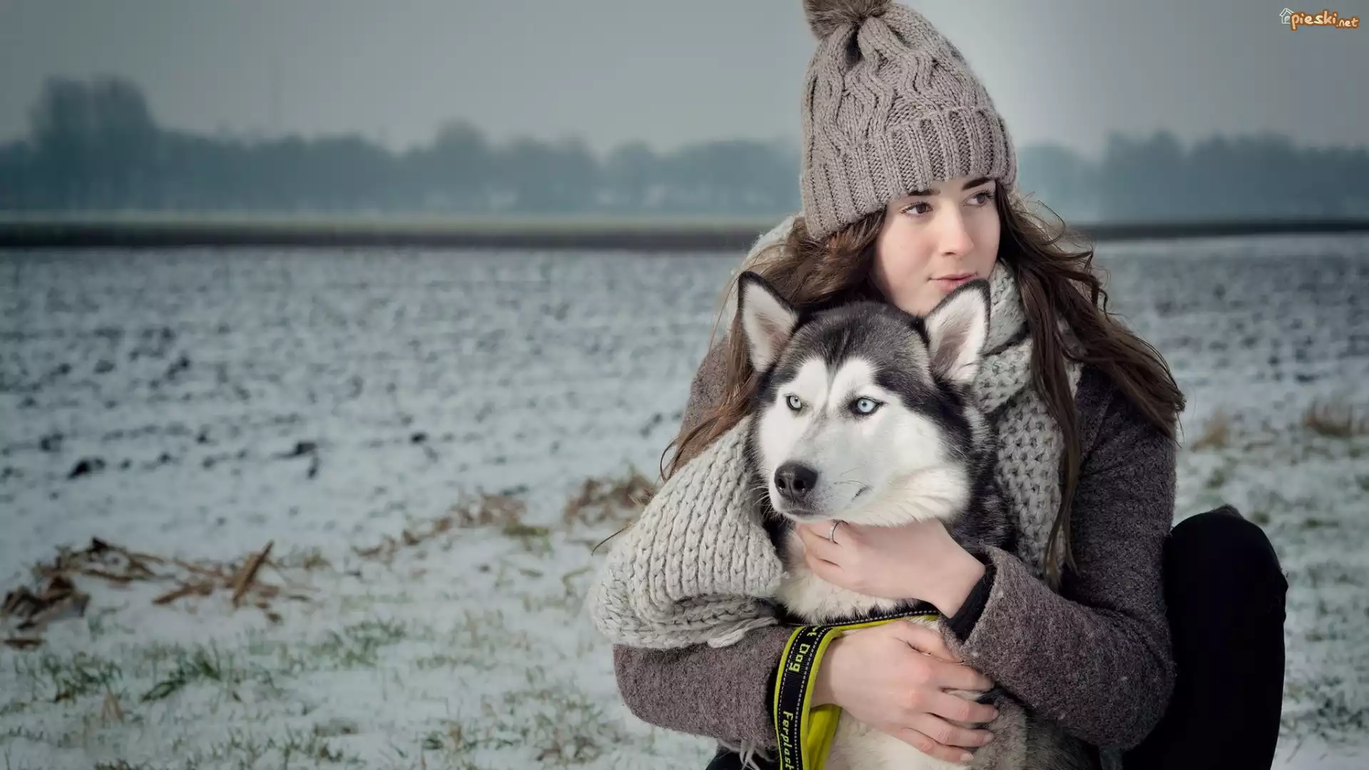 Pies Pies, Siberian husky, Czapka, Pole, Dziewczyna, Szalik
