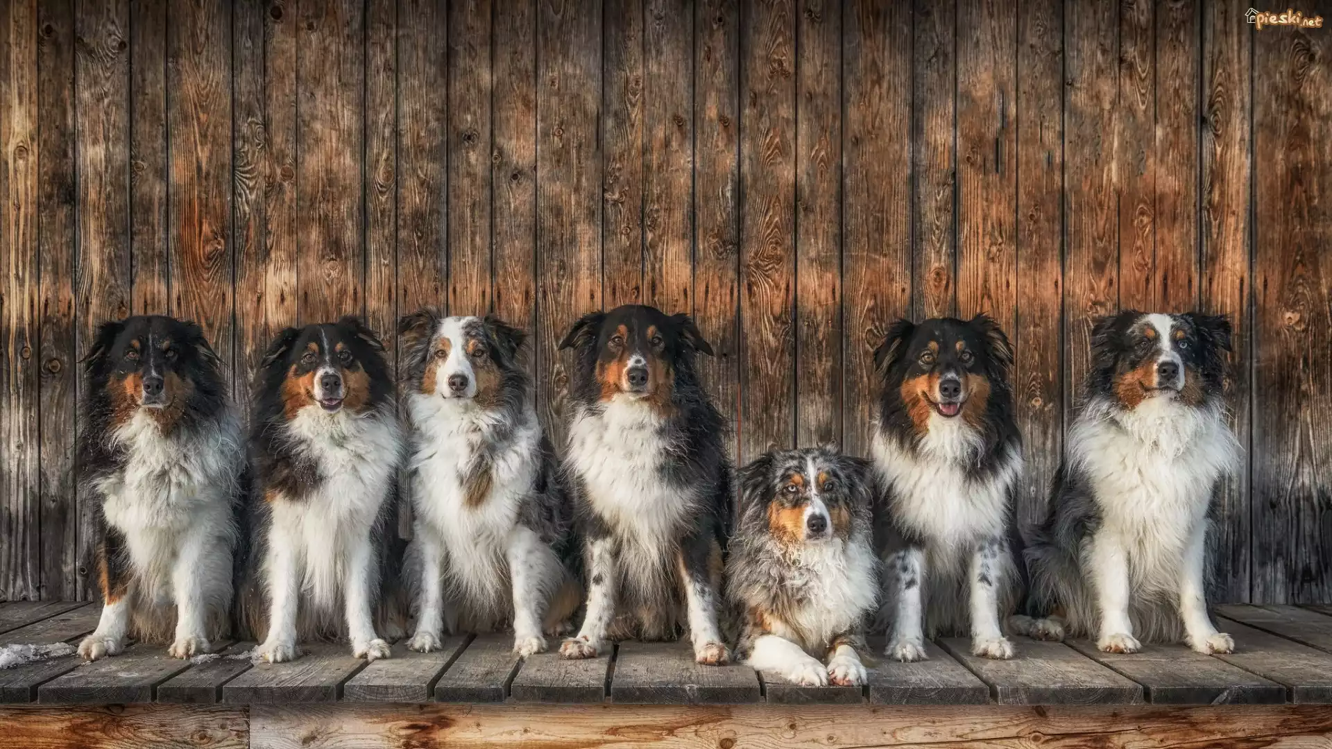Pies Psy, Siedem, Owczarki Australijskie, Drewniany, Podest, Ściana, Deski