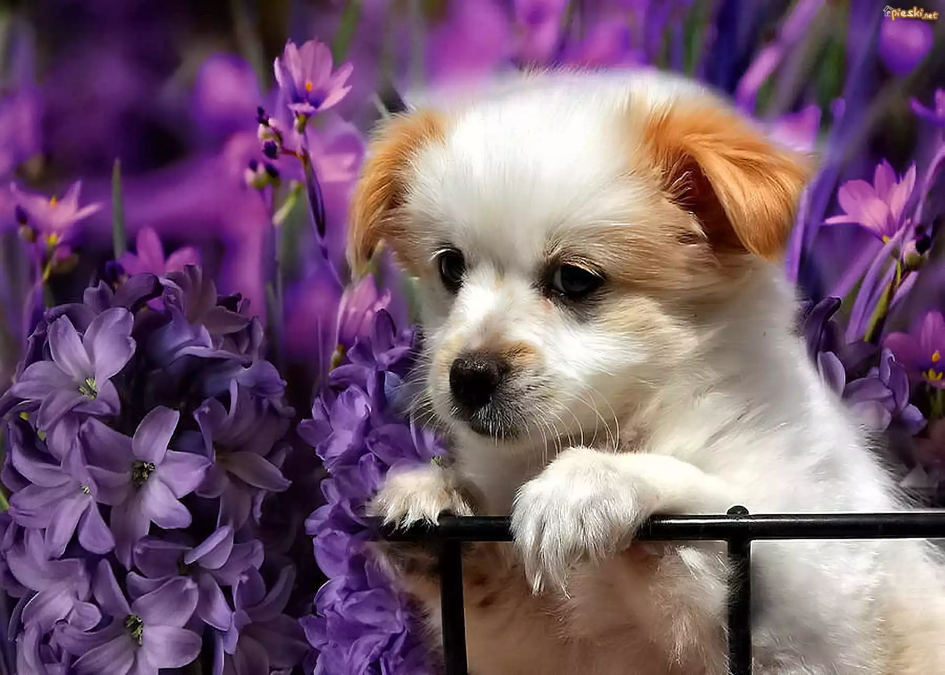 Pies Słodki, Szczeniaczek, Fioletowe, Kwiaty