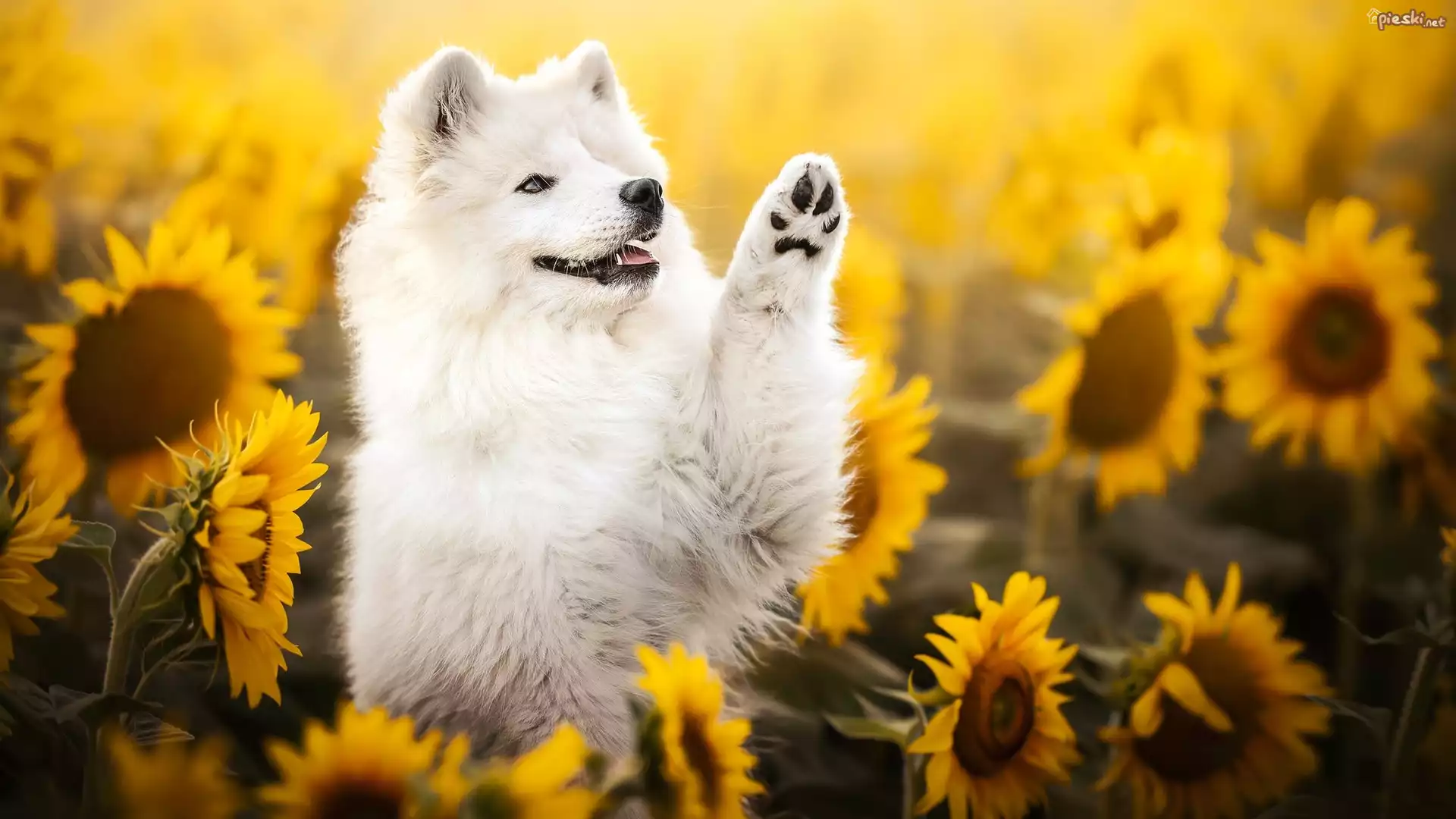 Pies Pies, Samojed, Kwiaty, Słoneczniki