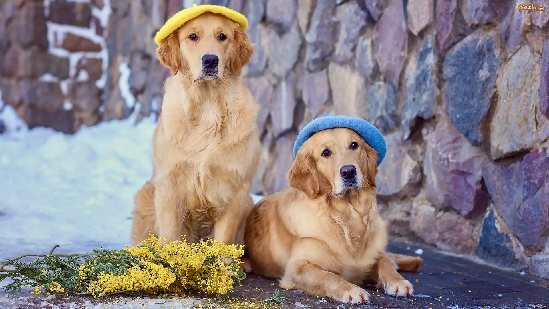 Psy, Golden retrievery, Berety, Gałązki, Akacja srebrzysta, Śnieg