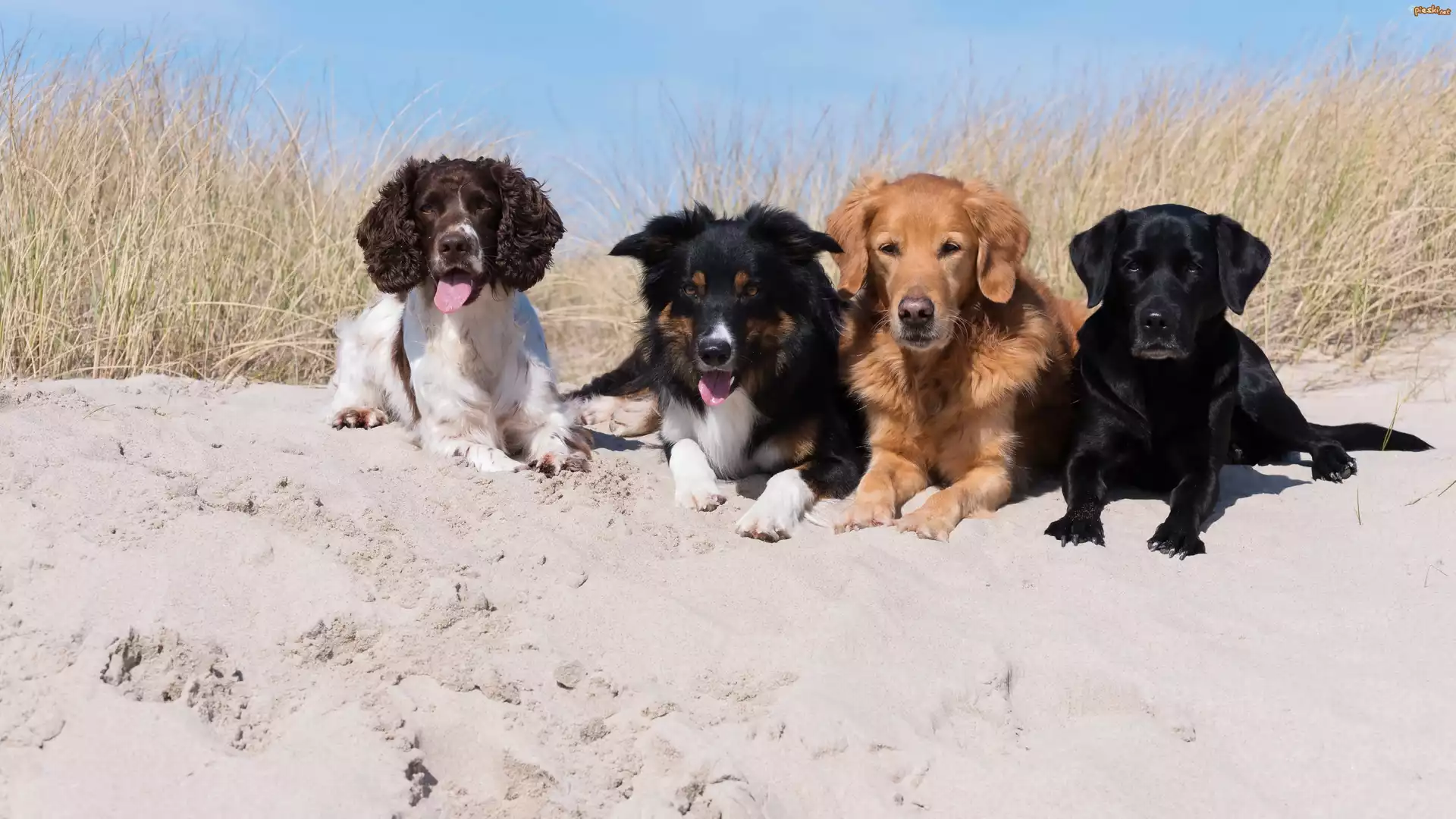 Pies Cztery, Psy, Spaniel angielski, Border collie, Golden retriever, Labrador retriever, Plaża, Piasek, Trawa |