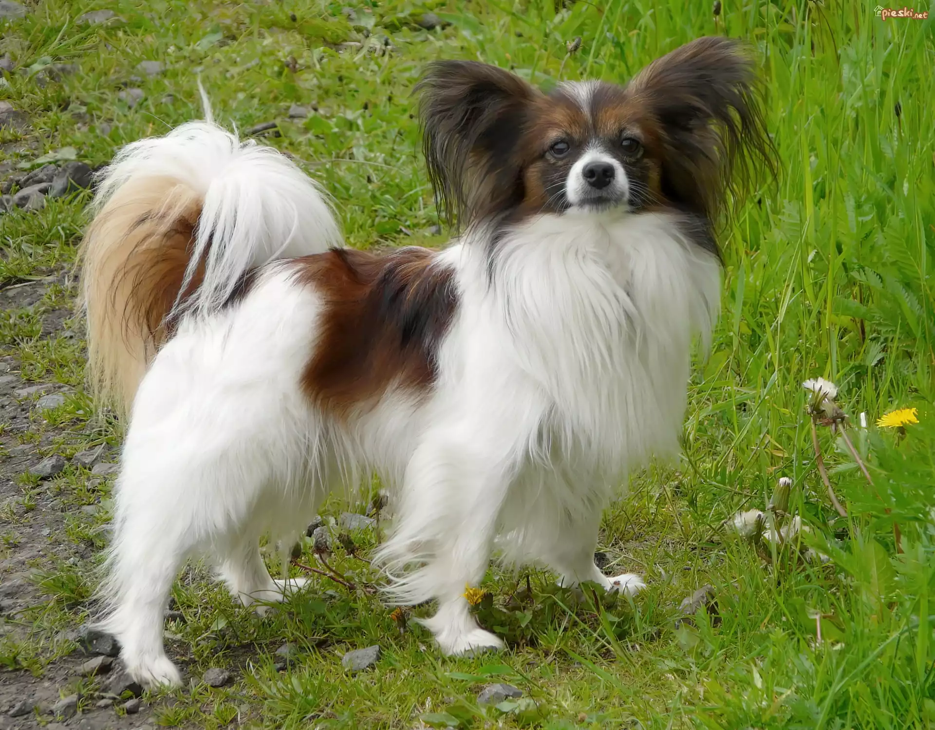 Spaniel kontynentalny miniaturowy Phalene, soczysta, trawa