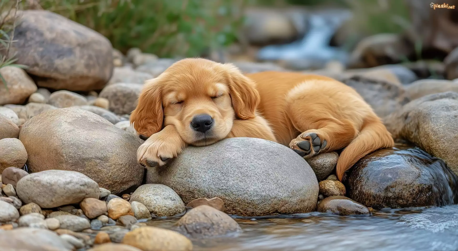 Szczeniak, Śpiący, Pies, Kamienie, Woda