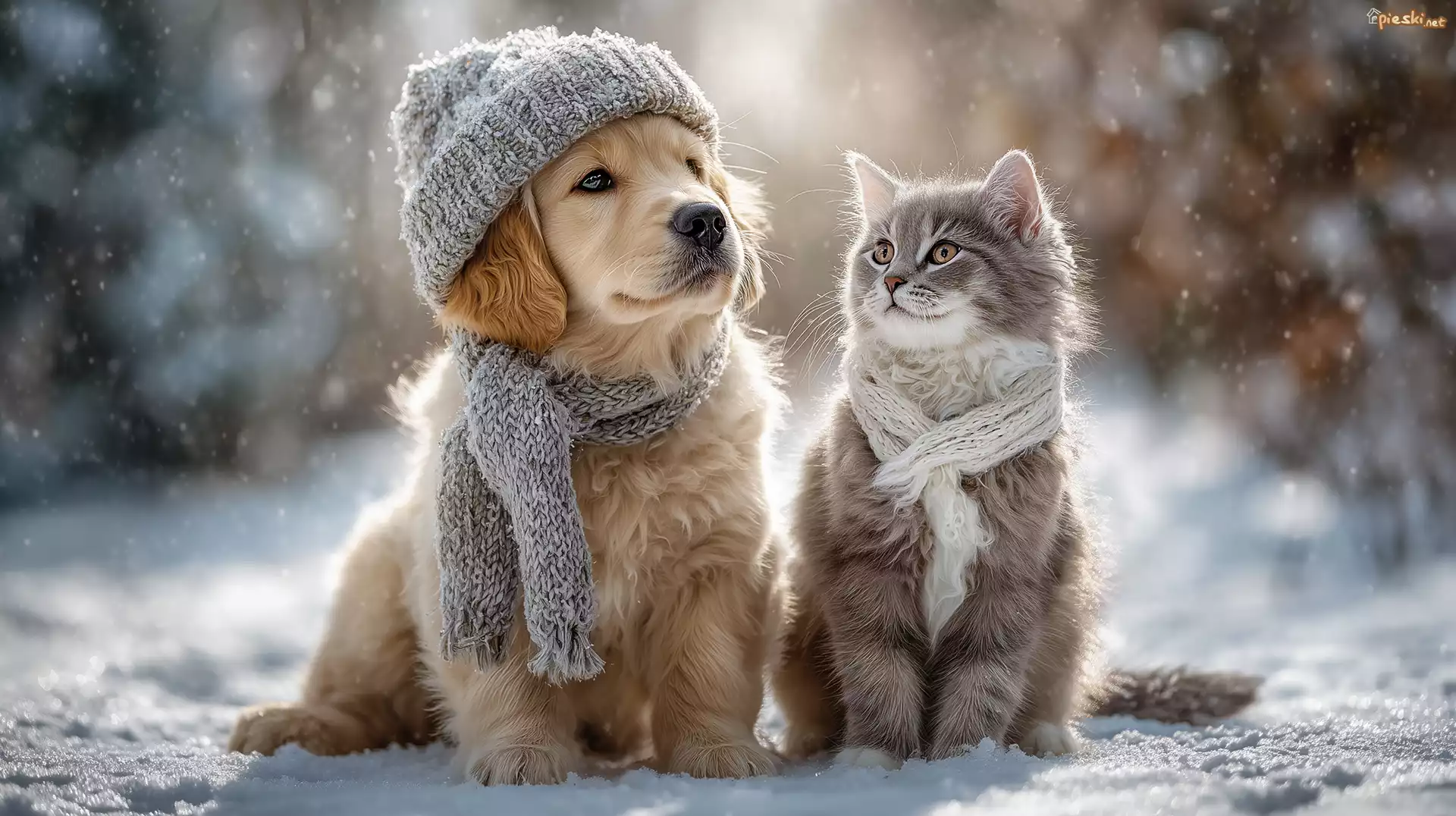 Pies, Kot, Czapka, Szalik, Zima, Grafika AI