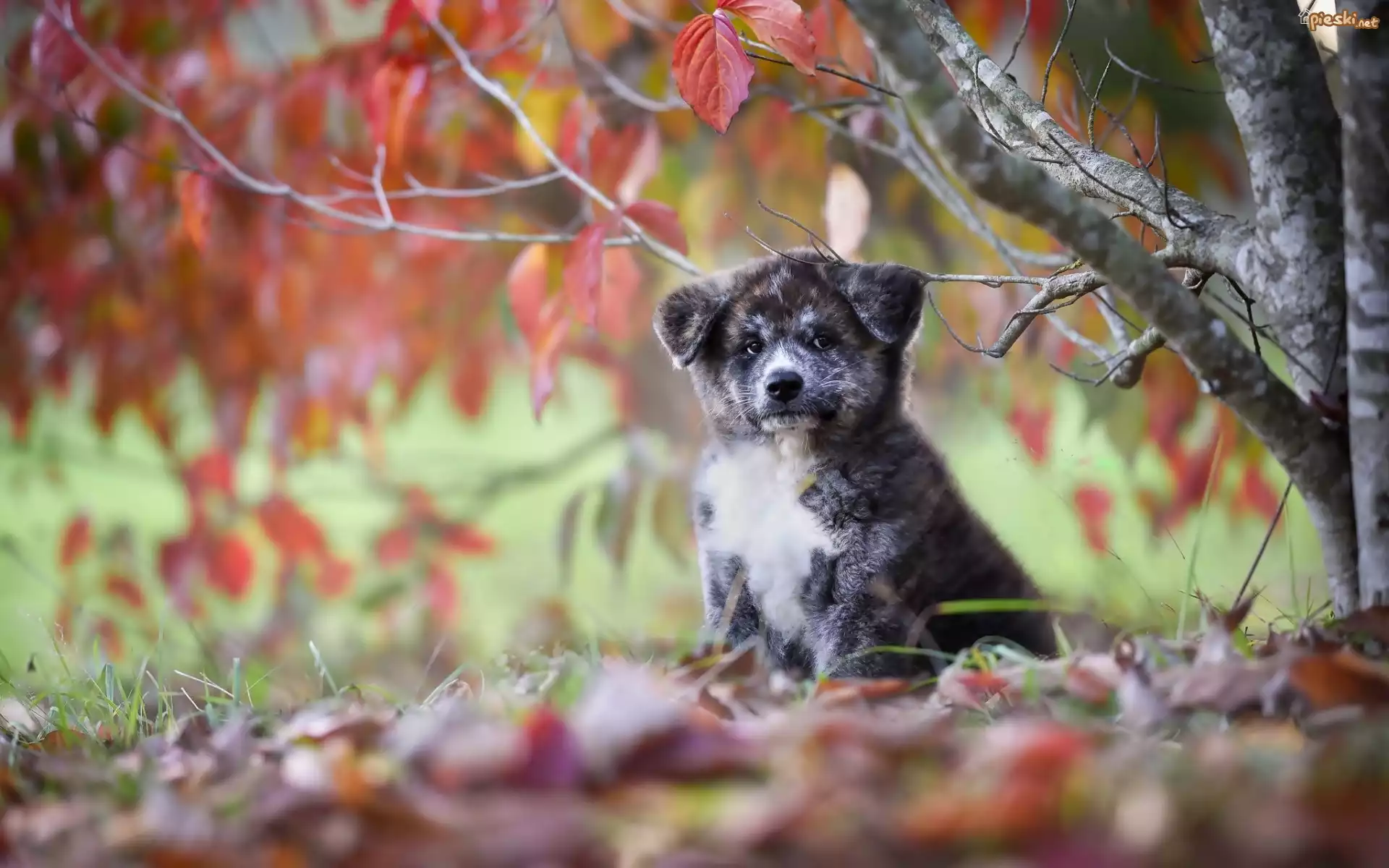 Pies Szczeniaczek, Akita inu, Drzewo, Liście, Jesień
