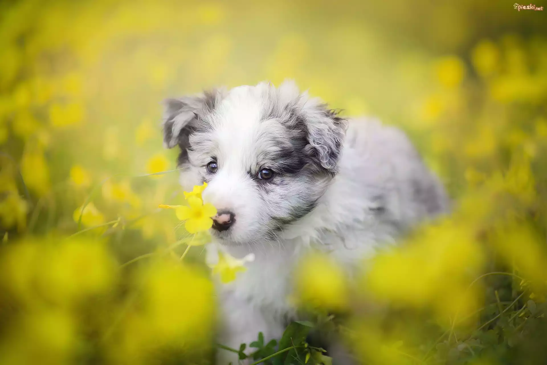 Pies Szczeniak, Border collie, Łąka, Kwiaty