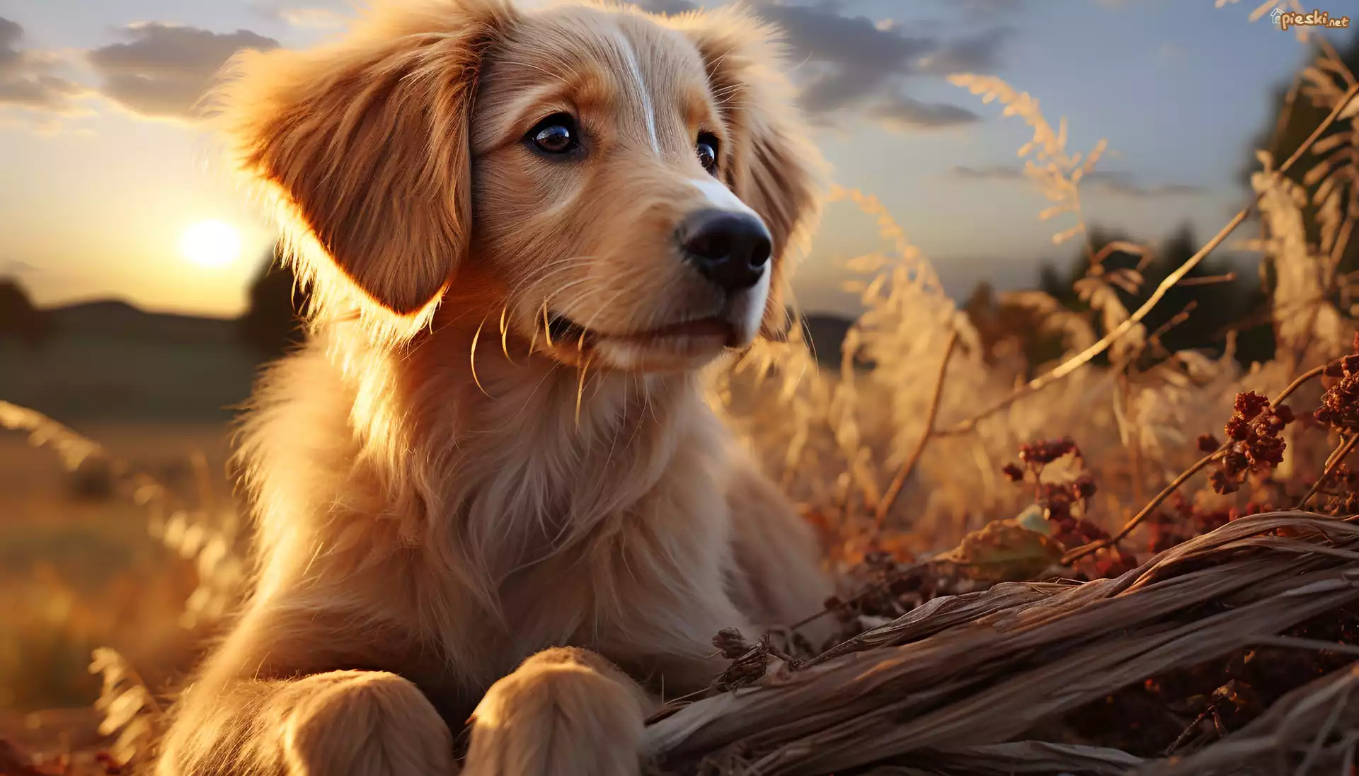 Golden retriever, Pies, Szczeniak, Rośliny, Grafika