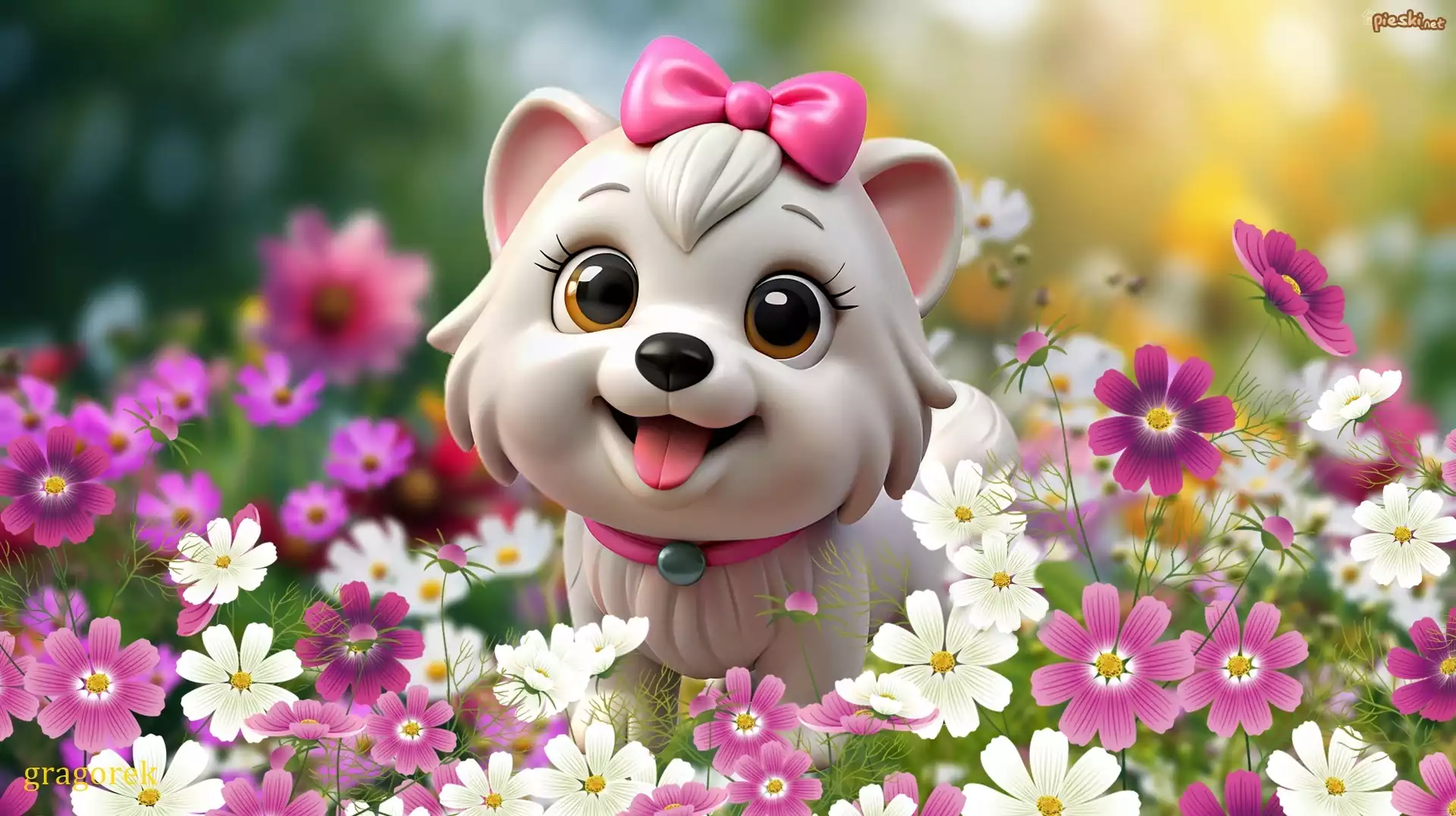 Pies Pies, Szczeniak, Kosmea, Kwiaty, Grafika
