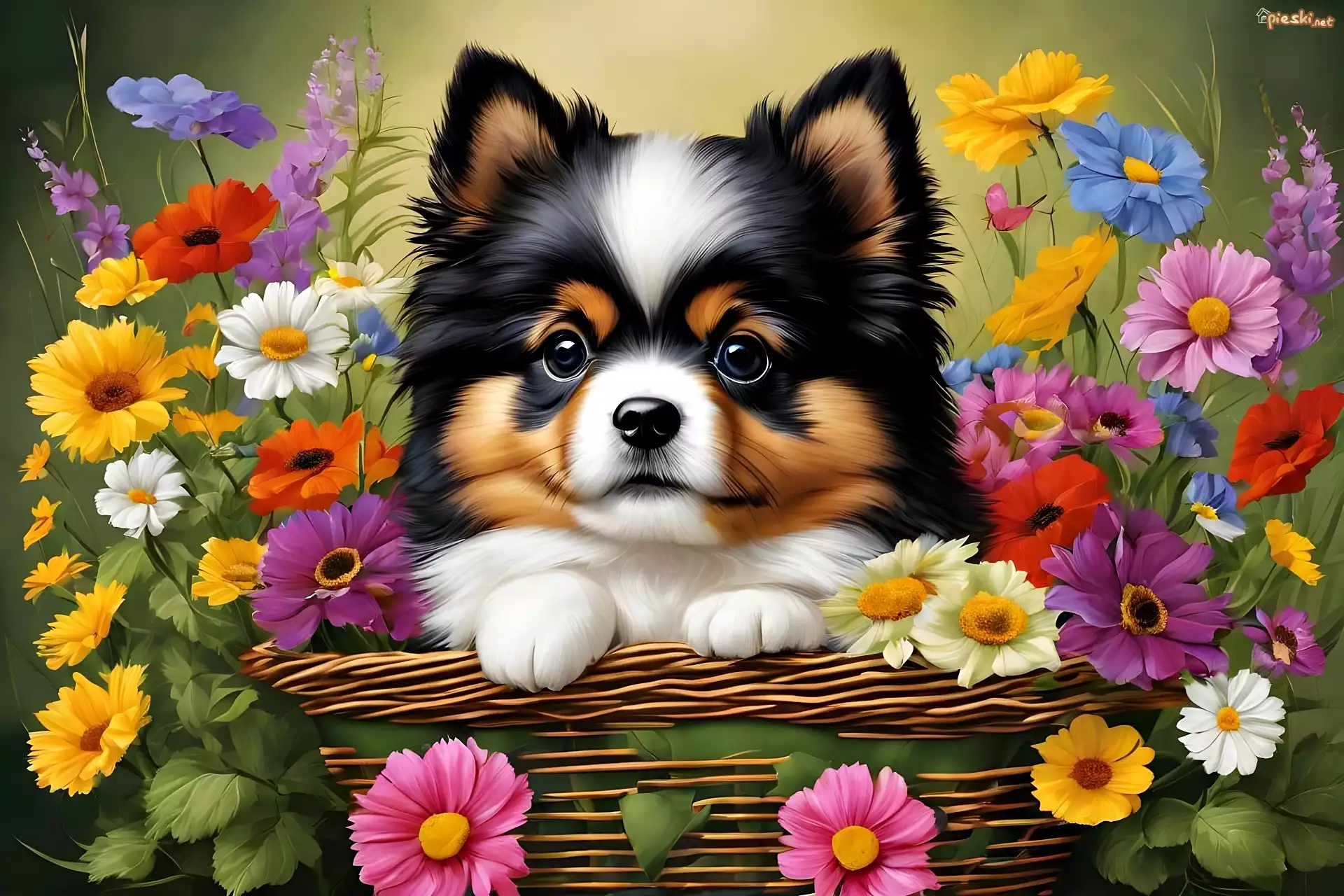 Pies Pies, Szczeniak, Kwiaty, Koszyk, Grafika
