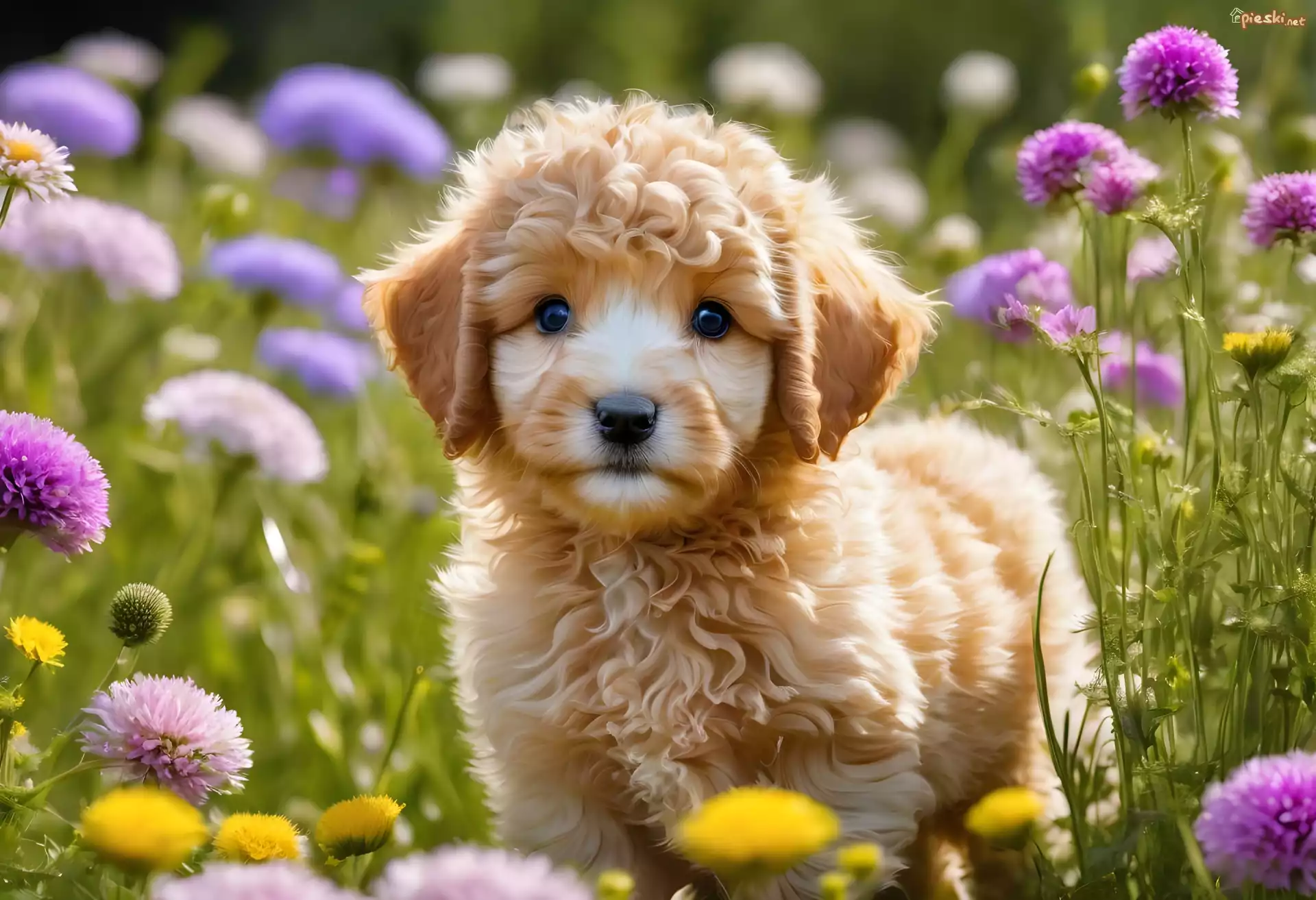 Pies Pies, Szczeniak, Kwiaty, Łąka, Grafika