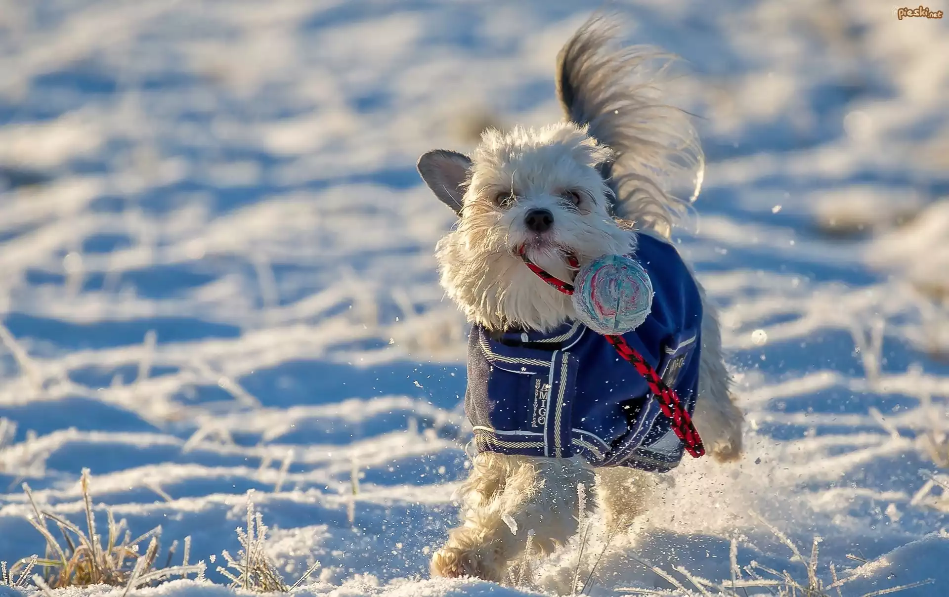 Pies Szczeniak, Zabawa, Piłka, Śnieg