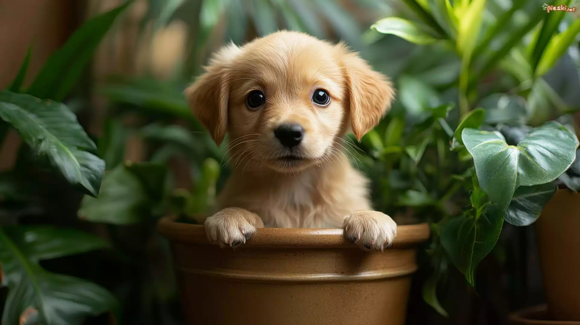 Pies, Szczeniak, Spojrzenie, Donica, Liście