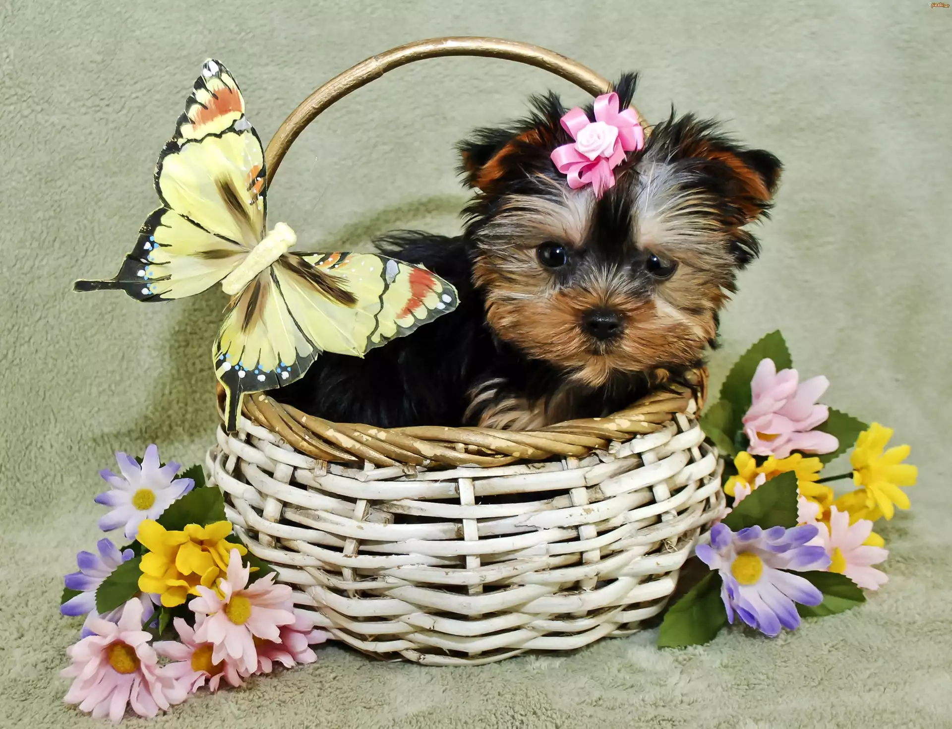 Pies Szczeniak, Koszyk, Kwiatki, Motyl, Yorkshire Terrier