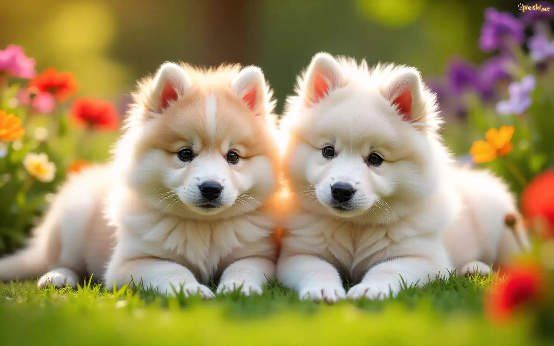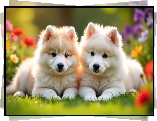 Pies Dwa, Białe, Psy, Szczeniaki, Grafika AI